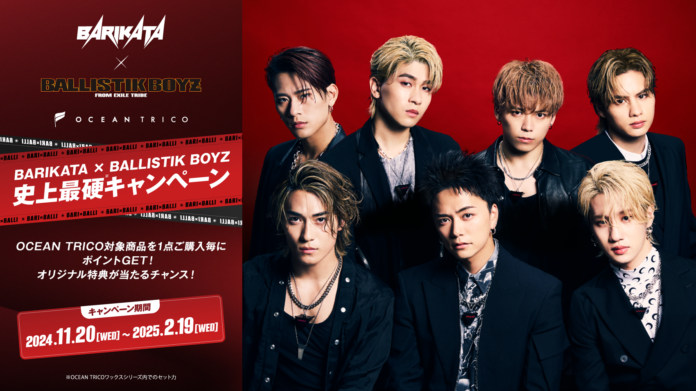株式会社フィッツコーポレーション(東京都港区、代表取締役:富樫康博)は、原宿発の美容室「OCEAN TOKYO(オーシャントーキョー)」プロデュースのブランド「OCEAN TRICO(オーシャントリコ)」と、BALLISTIK BOYZを起用した「BARIKATA×BALLISTIK BOYZ 史上最硬※キャンペーン」を実施いたします。キャンペーン期間は2024年11月20日(水)~2025年2月19日(水)で、対象製品を対象店舗でご購入いただいたお客様は、オリジナル特典が当たる各種コースへの応募が可能です。