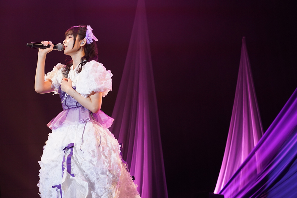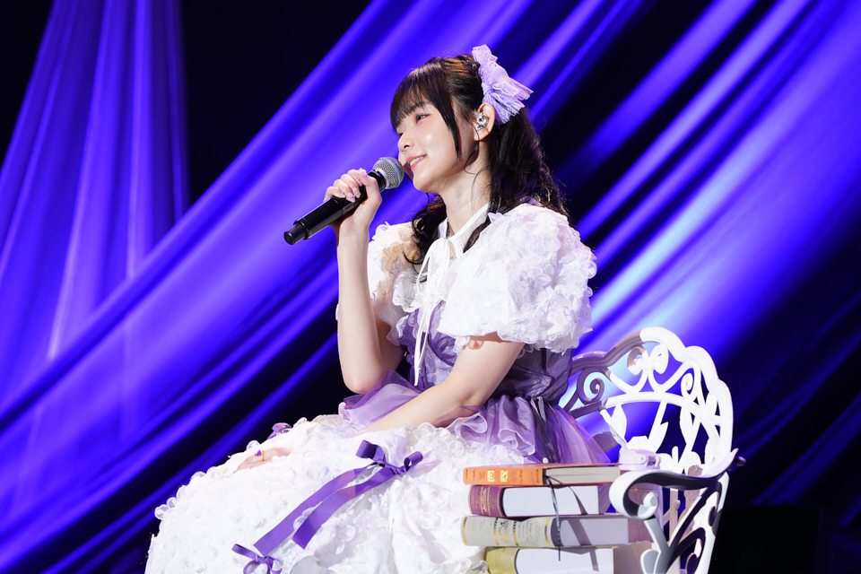 「記憶ファンタジック」は、何と言ってもメロディアスで広がりのあるサビが気持ちいい。2コーラス目からはステージに置いてあったガーデンベンチに座りながら歌っていく。少し肌寒くなり、イルミネーションが広がる今の季節にぴったりな楽曲を、かわいらしいボーカルで歌うと、続いては、反対側にある椅子に座って、本を開きながらミディアムバラード「Storytelling」を語りかけるように歌う。物語のように深くて壮大でキラキラしたサウンドも、この曲の聴きどころだ。1stアルバムのときは、これから歩んでいく新しい物語を歌っていく曲だったが、今はこれまでを振り返っているようにも感じたし、さらにこの先もみんなと歩いて行こうという。新たな決意の曲のようにも聴こえた。