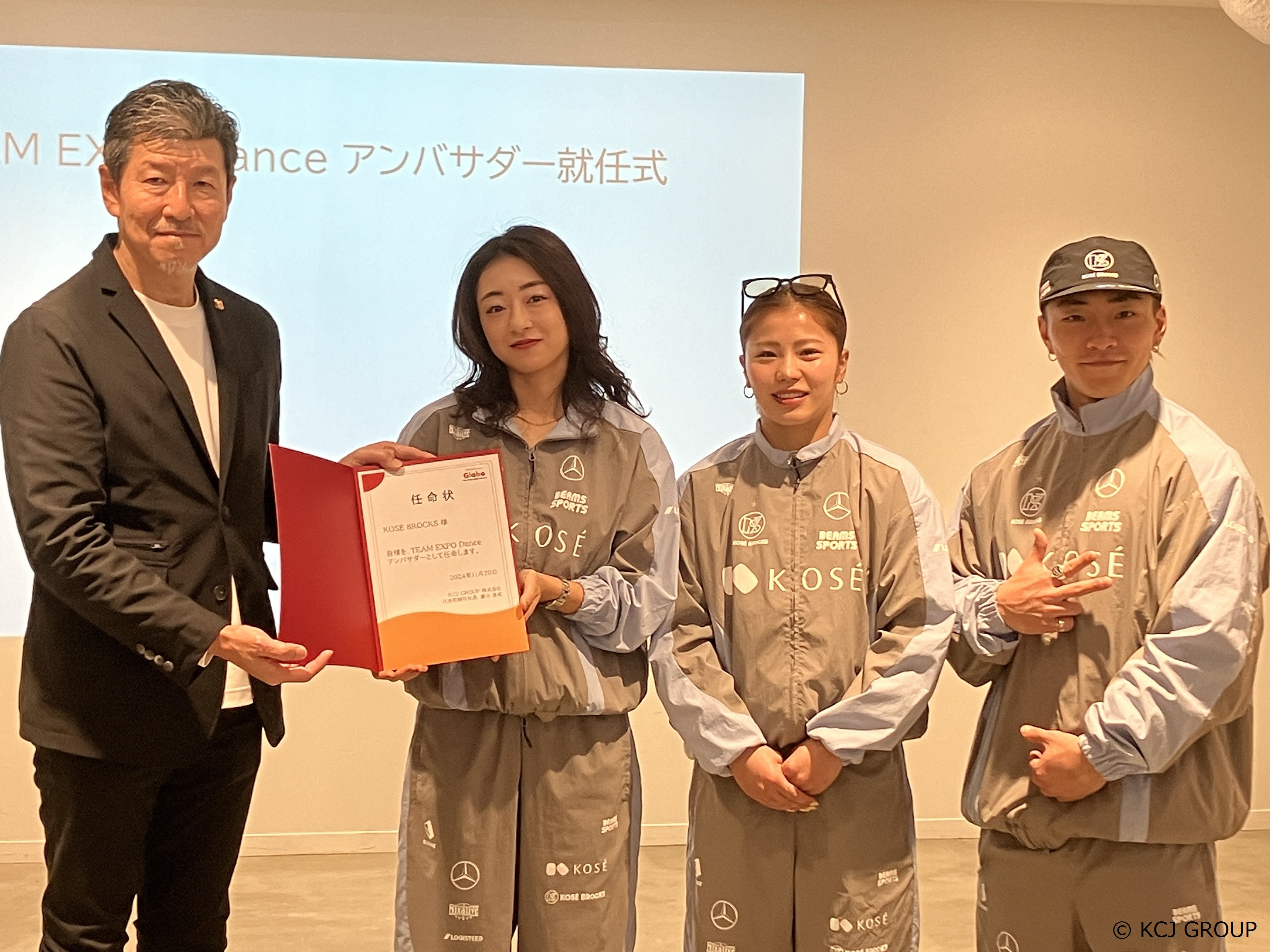 就任式では、「TEAM EXPO」としての活動変遷を紹介した後、2024年8月に実施したワークショップ「ダンス×映像で世界へ届け!-Create our voices PJ-」をダイジェスト動画(※3)で振り返りました。そして、KCJ GROUP代表取締役社長 圓谷 道成、KOSÉ 8ROCKS Haruka氏、Yuika氏、YU-KI氏が登壇し、就任式・フォトセッションを行った後、KOSÉ 8ROCKSからのメッセージ動画が上映されました。