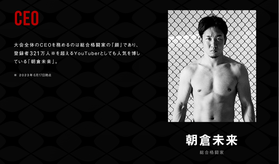 登録者数340万人超え(2024年10月現在)の人気YouTuberでもある総合格闘家の朝倉未来がCEOを務め、スペシャルアドバイザーとして総合格闘家の朝倉海、総合格闘家の白川陸斗が参画しています。