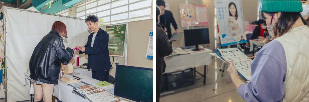 EXILE MAKIDAI氏はステージ登壇後、「知って、肝炎プロジェクト」ブースに立ち寄り、「全国ご当地うどんサミットinさぬき」の来場者に対して、肝炎ウイルス検査の呼びかけや肝炎クイズ、アンケートの協力をお願いしました。ブースでは、来場者一人ひとりに笑顔で声をかけ、肝炎に関する知識を深めてもらいました。