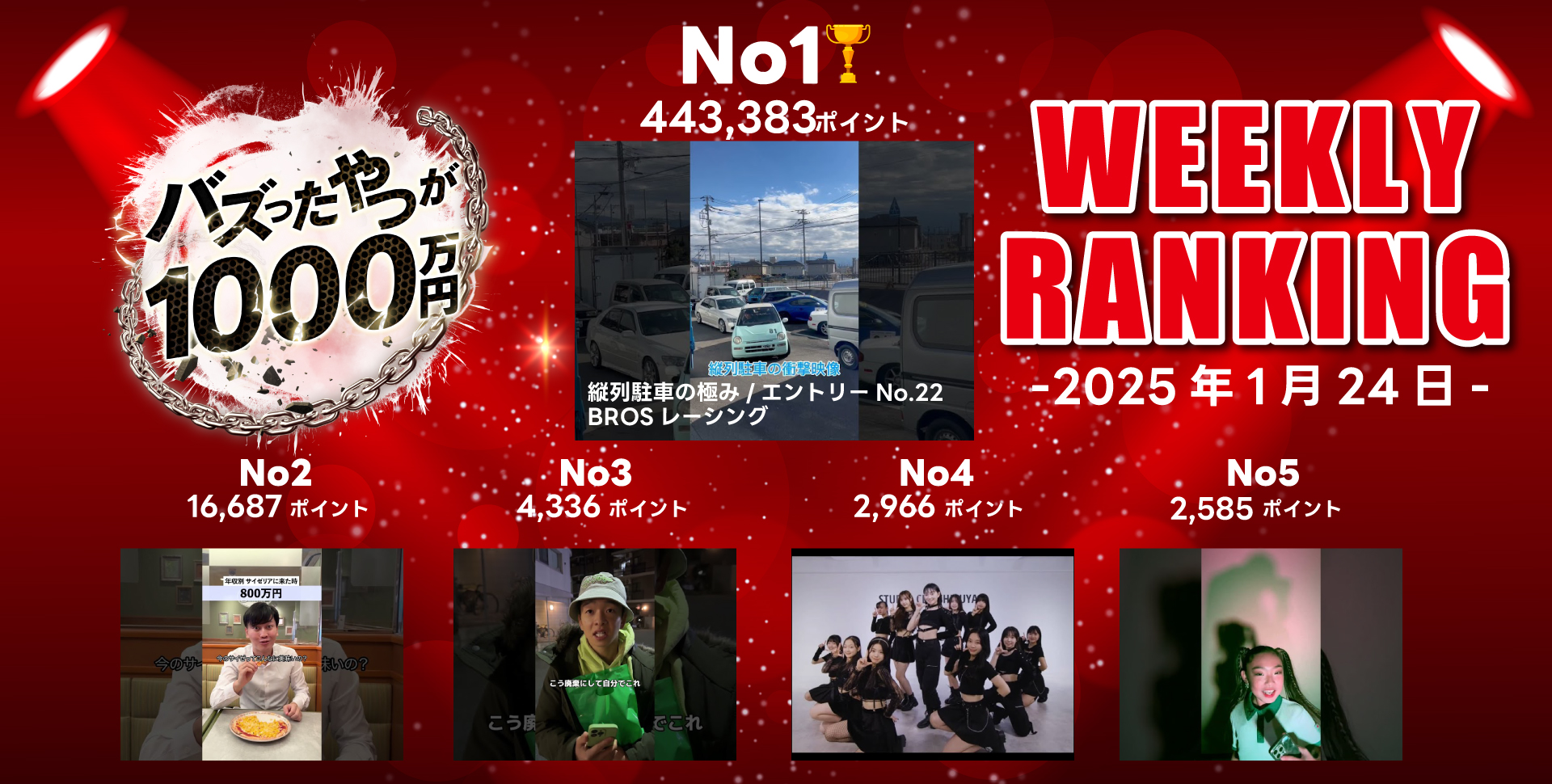 関東を中心にレンタルスタジオを60店舗以上運営するSTUDIO BUZZ(バズスタジオ)や、アーティストのプロダクションなどを運営する株式会社BUZZ GROUP(本社:東京都港区、代表取締役:渡辺 憲)より、日本のエンターテインメント産業を盛り上げるべく開催中の超大型企画「バズったやつが1000万円」の週間ランキングをお知らせいたします。