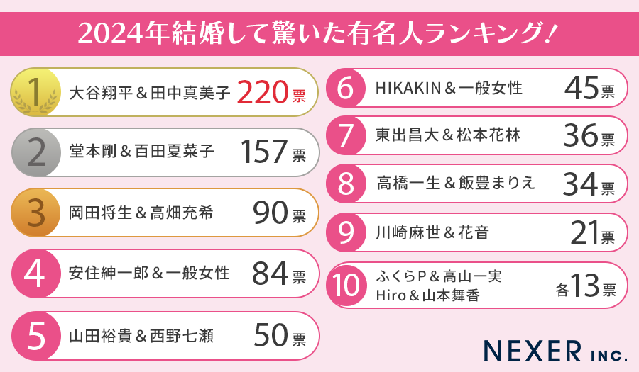 2024年結婚して驚いた有名人ランキング、第1位は「大谷翔平さん&田中真美子さん」でした。