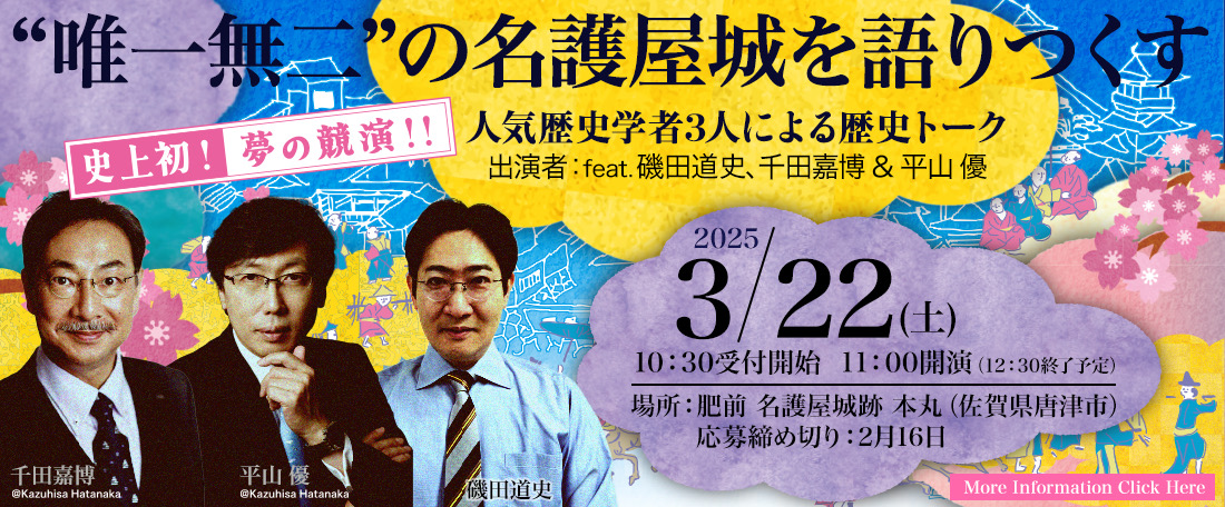 人気歴史学者、肥前名護屋城に大集結!磯田道史氏・千田嘉博氏・平山優氏が至宝・肥前名護屋城跡を語り尽くします!!