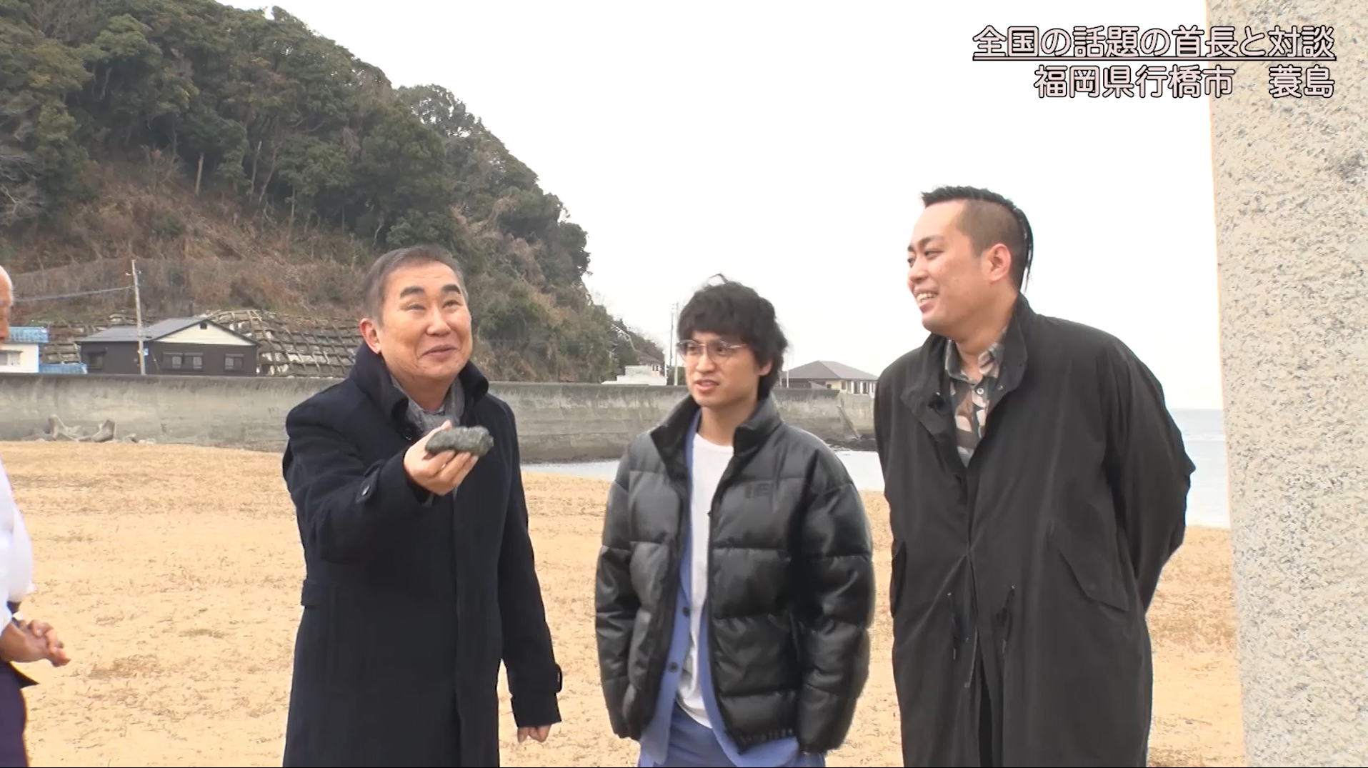 番組は、蓑島海水浴場でのロケからスタート。文枝が「あなたたちはこちら(行橋市)の出身?」とたずねると、佐々木は宮城県、町田は神奈川県の出身であることを告白。佐々木は「なんで案内人が僕らなのか謎です」と正直に話し、笑いを誘います。