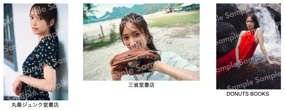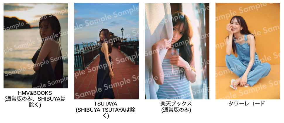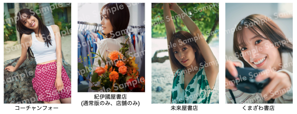 今回の書店別購入特典は、折り目なしB3ポスター4種とポストカード11種。マレーシア・ランカウイ島でのびのびと卒業旅行を楽しむくみてんと東京で撮影した写真集未掲載カットを採用。折り目なしB3ポスターの特典がついてくる店舗は、HMV&BOOKS SHIBUYA、SHIBUYA TSUTAYA、セブンネットショッピング、星野書店 近鉄パッセ店の4店舗。ポストカードは、HMV&BOOKS(通常版のみ、SHIBUYAは除く)、TSUTAYA(SHIBUYA TSUTAYAは除く)、楽天ブックス(通常版のみ)、タワーレコード、コーチャンフォー、紀伊國屋書店(通常版のみ、店舗のみ)、未来屋書店、くまざわ書店、丸善ジュンク堂書店、三省堂書店、DONUTS BOOKSの11店舗となります。