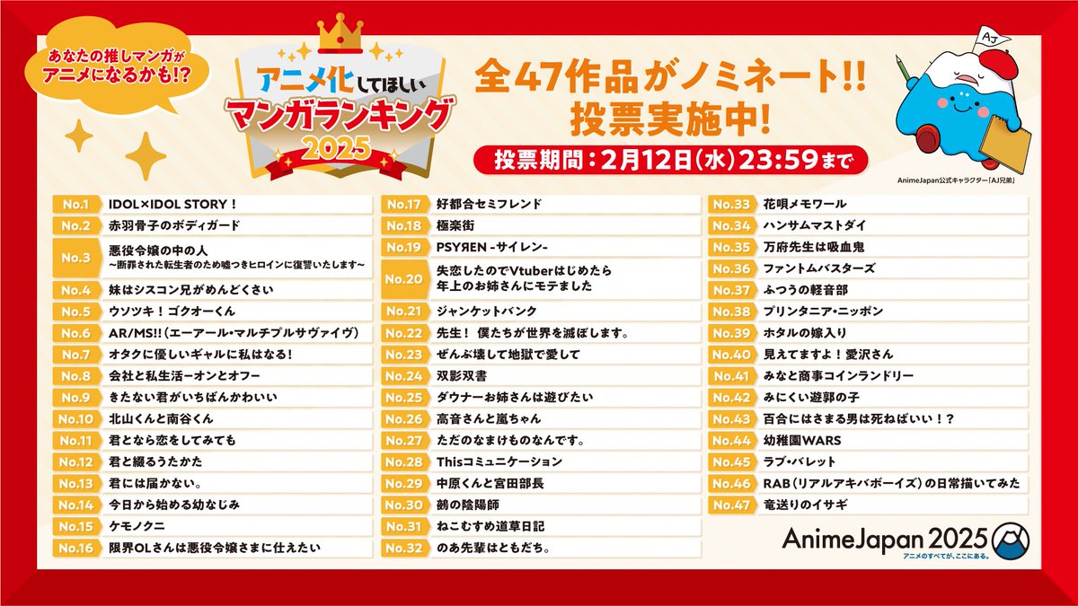 「アニメ化してほしいマンガランキング」は、アニメ化を望む声が多いマンガ作品をファン投票により選出し、ランキング形式で発表する企画です。今年は、TOP10作品がAnimeJapan 2025会場内で展示されます。