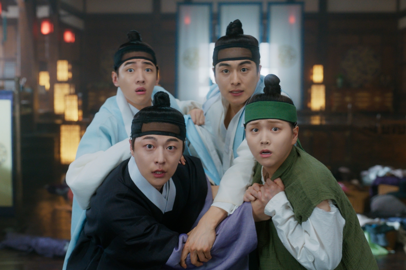 今回公開されたビハインド映像では、第1話から第3話までに登場する「ハオナ(ですが)四人衆」の象徴的なシーンの裏側が収められている。まず一つ目のビハインド映像では、「龍天楼」に集められた4人が初日の着替えで早速騒動を巻き起こす姿が描かれる。この場面は、ドクスの胸元に隠された「黃銅金匙(ファンドングムシ)」を確認しようと無理やり手を伸ばすウノ、女であることを必死に隠すドクス、何とかウノを制止しようとするジュナ、自分の衣服をジュナに着られ取り返そうとするスラ。彼らのコミカルなやり取りに笑いが溢れるシーンで、本作のユーモアと活気を感じさせる重要なエピソードだ。実際の撮影現場では、ジュナのセリフに笑いを堪えられずに吹き出してしまう四人の姿が収められている。
