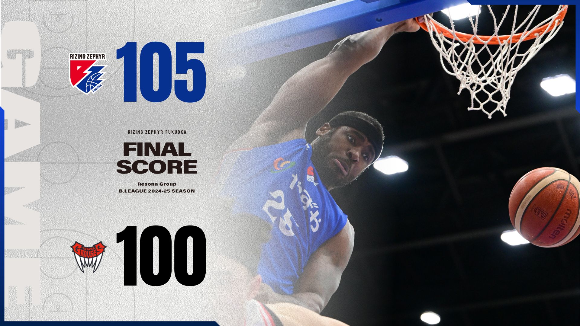 2025年2月9日(日)に開催したりそなグループB.LEAGUE 2024-25シーズン【ライジングゼファーフクオカvs.富山グラウジーズ】において“福岡105-100富山”で福岡の勝利となりました。