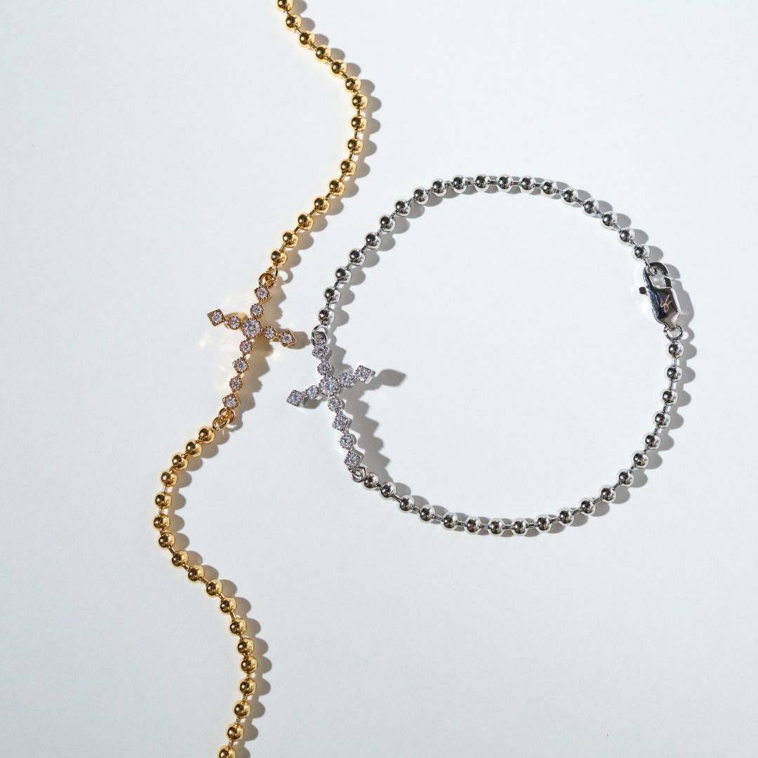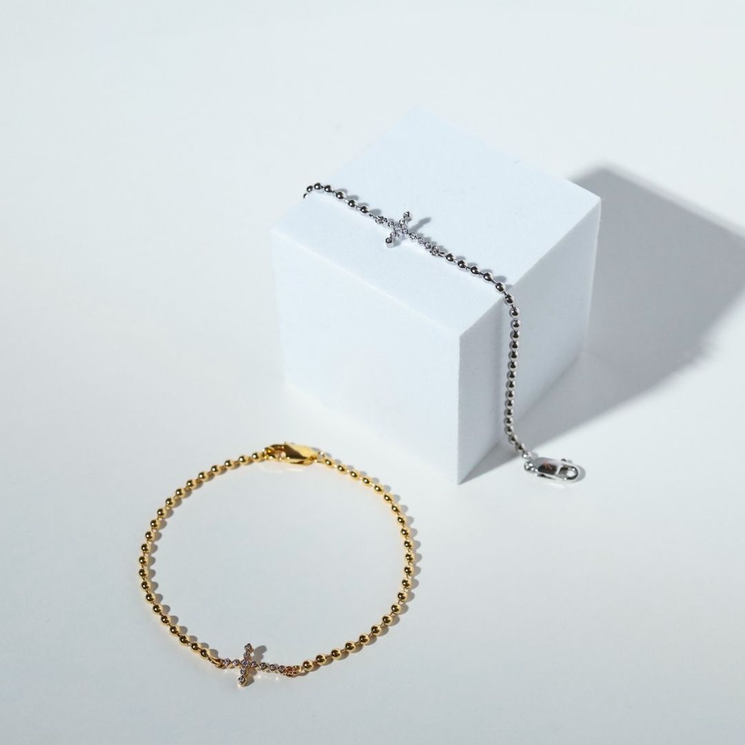 小さめのクロスモチーフが連なるこのブレスレットは、繊細で控えめながらも、手元に華やかな輝きを与えます。シンプルでありながらエレガントなデザインは、普段使いにも特別なシーンにもぴったりです。重ね付けすることで、さらに個性を引き立てるアクセサリーです。