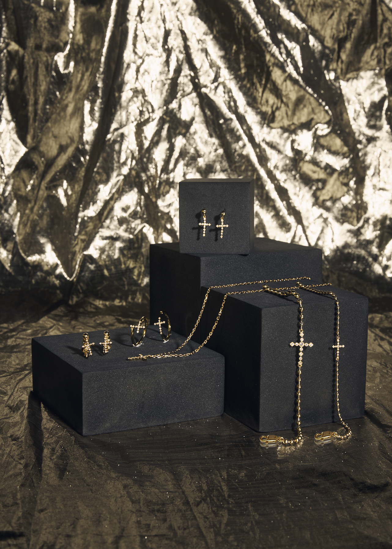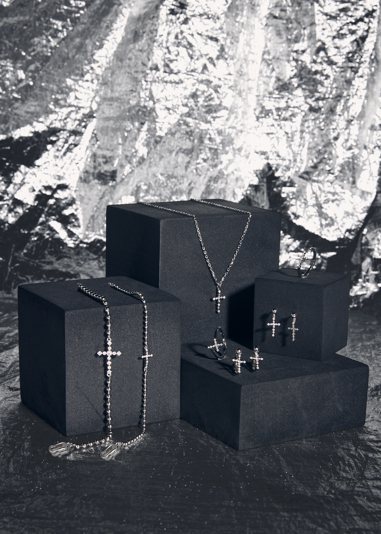 これまでにブラックパールやピンクゴールドを取り入れたアクセサリーコレクションを展開し、さらにはフレグランスの領域へと進出してきた本コラボレーション。今回は、藤原が幼少期から愛し続けてきたクロスモチーフにフォーカスした、新たなアクセサリーコレクション「Eternal Cross」を発表します。