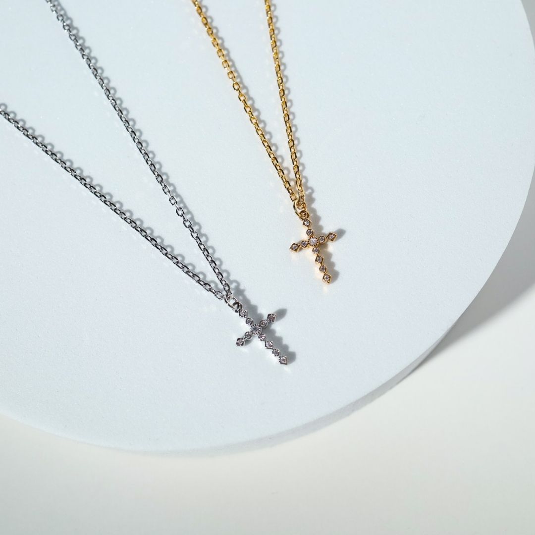 クロスモチーフにキュービックジルコニアを配したこのネックレスは、角ばったしっかりとしたチェーンを採用しており、トップのデザインとのアンバランスが魅力。スライド式の金具を備えているため、長さの調整が自由自在で、他のネックレスとのレイヤードスタイルも楽しめます。留め具部分には藤原の直筆デザインされた「if」の刻印が施されており、こだわりが感じられる特別なアクセントになっています。