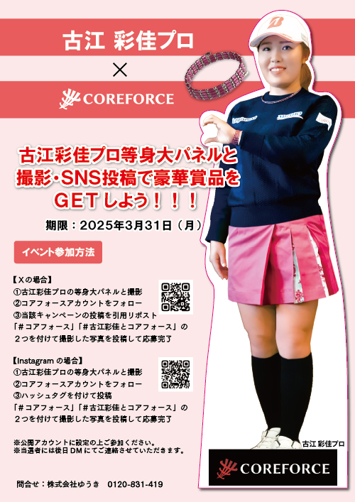 COREFORCE取扱店の約200店舗で古江彩佳プロの等身大パネルを設置。SNSに投稿で古江彩佳プロサイン入りボールとコアフォース製品などが抽選で当たるキャンペーンを実施。