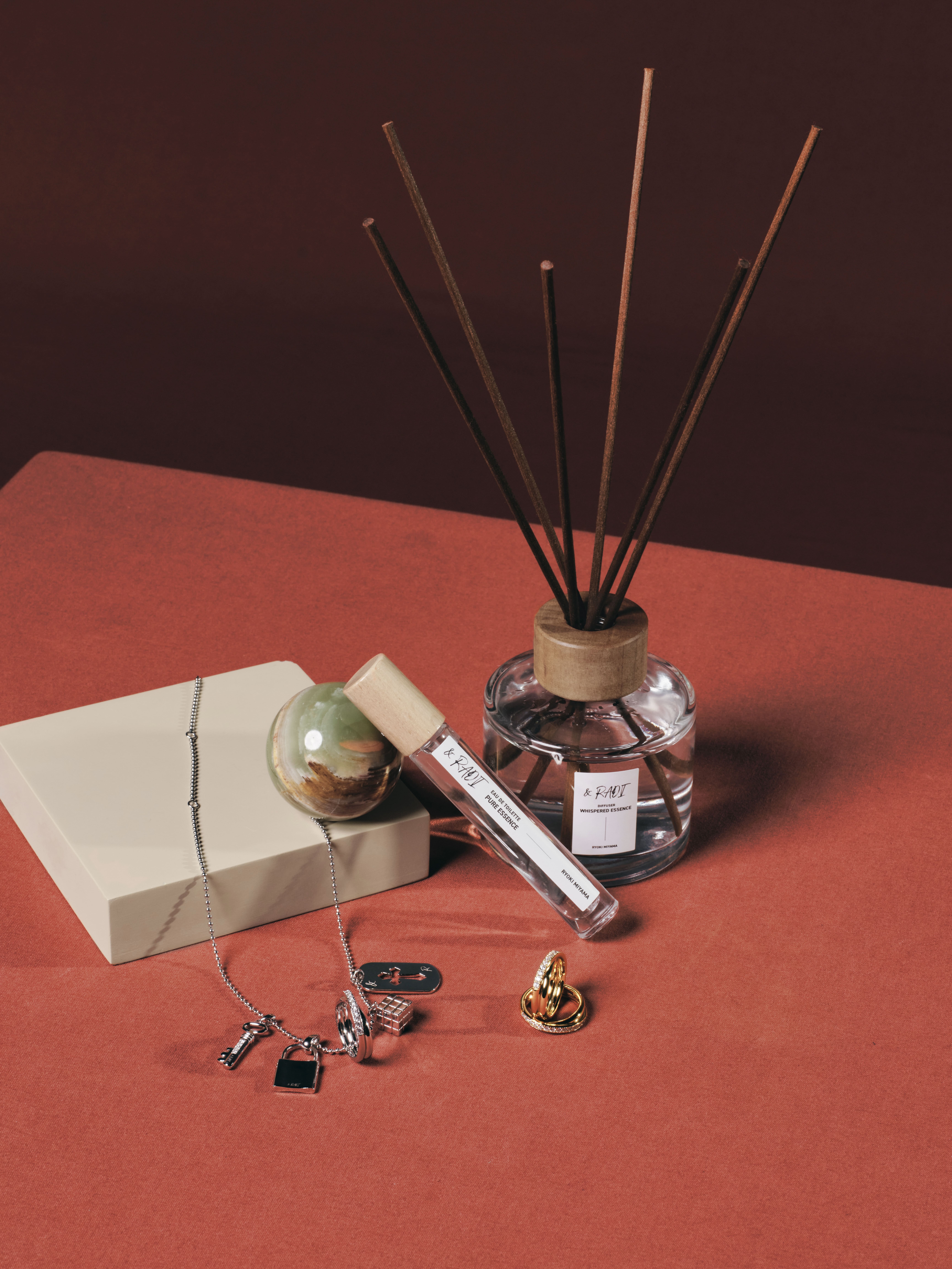 1st コレクションのラインナップは個性が際立つデザインと深い想いが織りなす、アクセサリー2種、そして空間と心に、厳選された香料と洗練されたデザインが調和した香りのアイテム2種を展開。 ひとつひとつのアイテムに、自己表現と個性の解放という三山の強い想いが込められ、身につけるあなたの新たな魅力を引き出します。