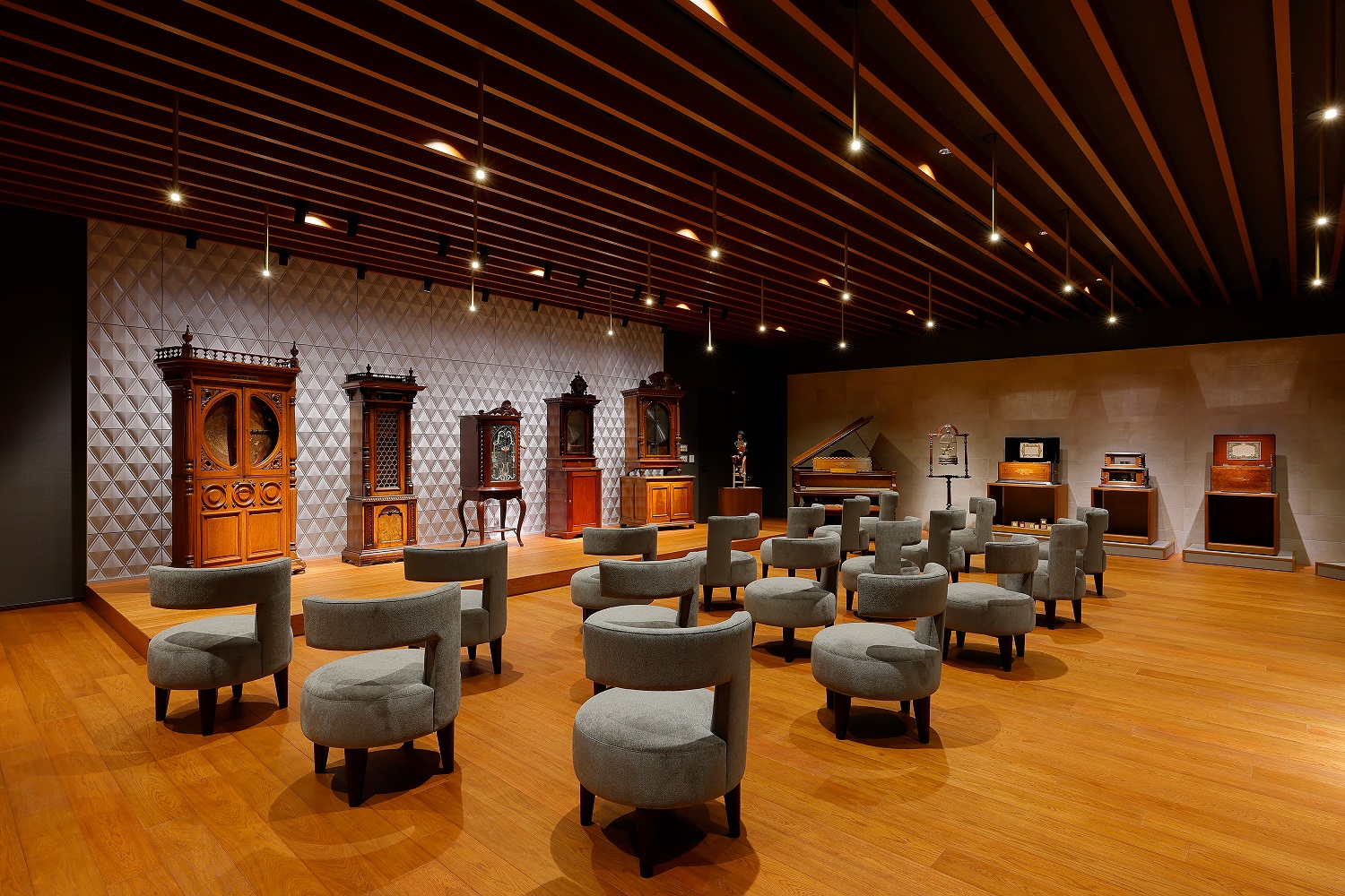 2023年3月に開館した永守コレクションギャラリーでは、100年以上前につくられたオルゴールやオートマタ、自動演奏ピアノなど、音楽史・美術史上希少なコレクション347点を所蔵。ガイドツアーにて実演・生演奏をご鑑賞いただける体験型施設です。世界的価値のある作品を贅沢に“ラウンジ鑑賞”できるほか、通常みることのできない“収蔵室”をガラス越しに見学でき、併設された“マイスター工房”では、オルゴールエンジニアによってコレクションの保守・修復や研究開発が行われています。