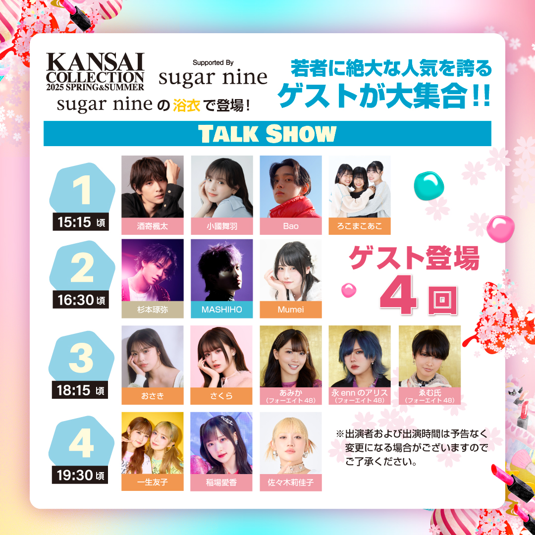 また、KANSAI COLLECTION史上初の試みとして、LIVE配信ゲストがアリーナ中継ブースに登場します。何時に誰が登場するかは当日のお楽しみに!