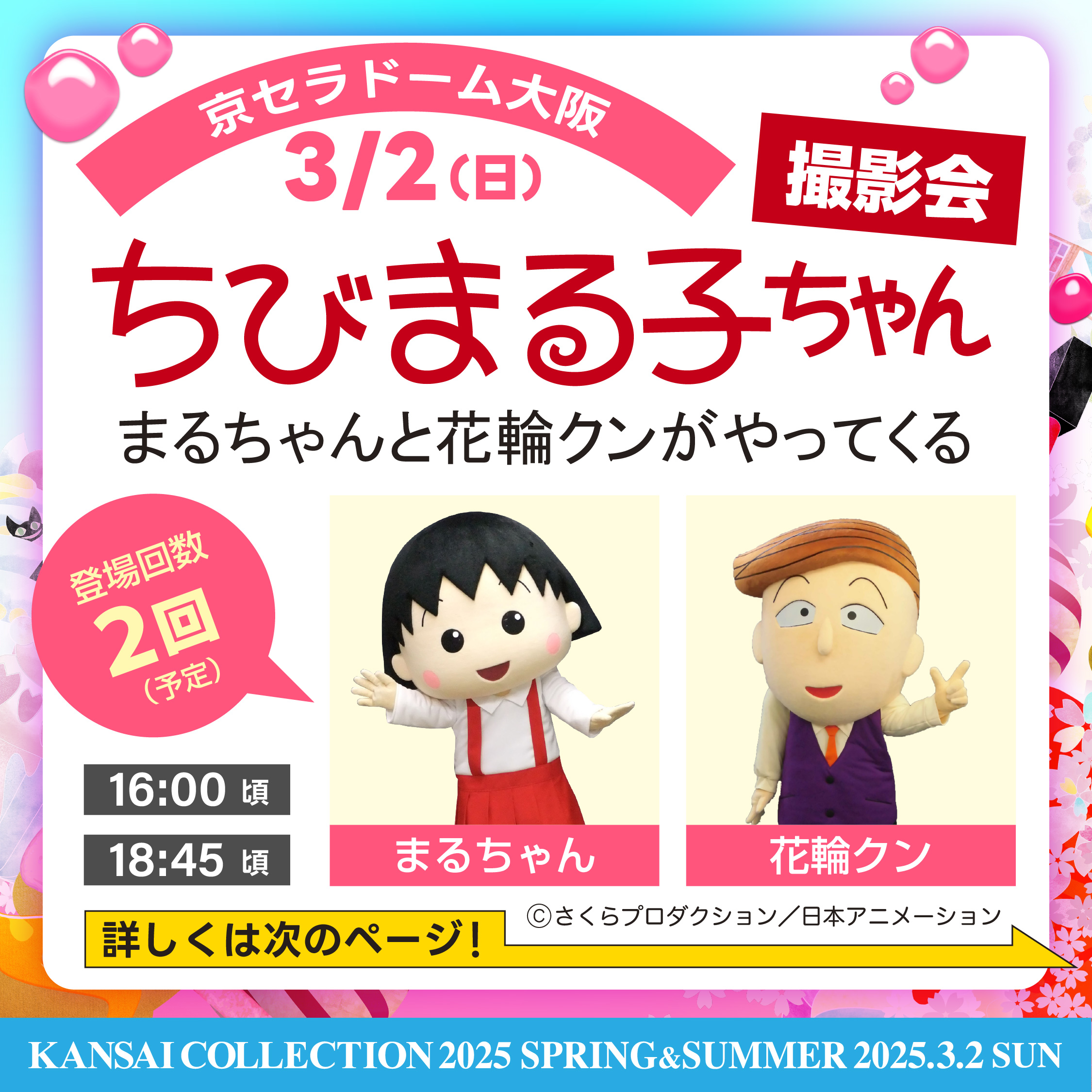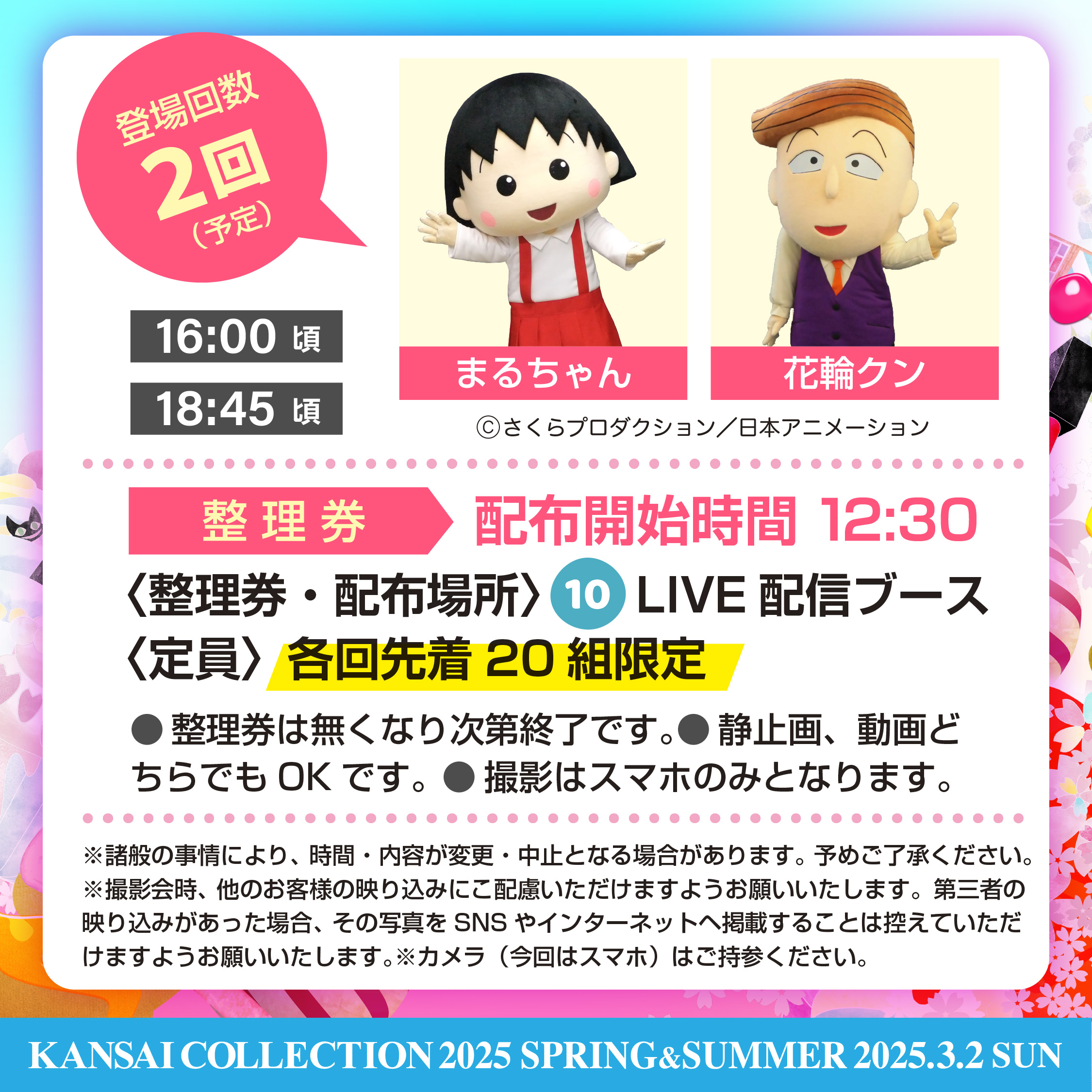 16:00頃と18:45頃に、LIVE配信ブースにまるちゃんと花輪クンが登場し、来場者と一緒に撮影会を開催します!