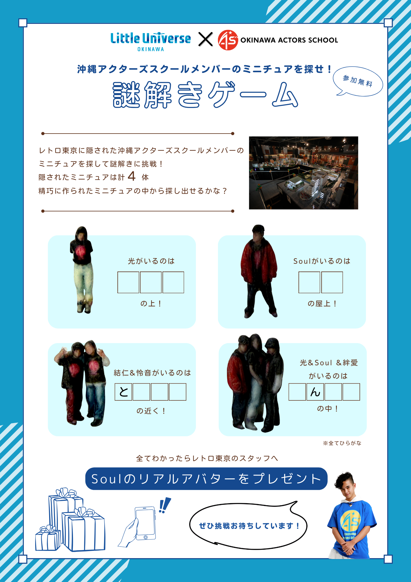 ミニチュアエリア「レトロ東京」に隠された沖縄アクターズスクールメンバーのミニチュアフィギュアを探す謎解きに挑戦。入場時に貰うシートを持ち、精巧に作られたミニチュアエリア内から約2cmの小さなメンバーのフィギュアを探し出して謎解きゲームをクリアしよう!クリアすると全員に「Soul」のリアルアバターをプレゼント。