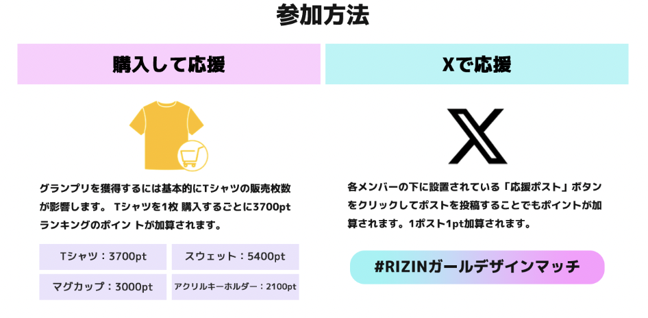 投票の結果入賞を果たしたRIZINガールには豪華な賞品をご用意しています。オリジナルグッズの購入やツイッター投稿など誰でも気軽に投票できる全員参加型イベントになっています。
