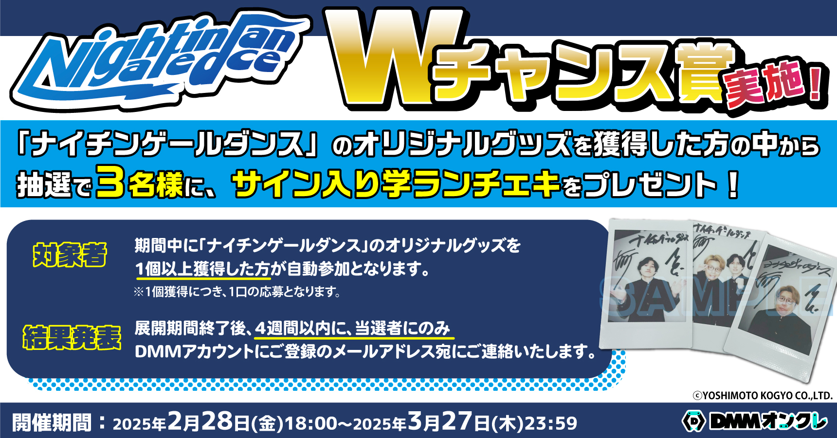 DMMオンクレにて「ナイチンゲールダンス」のオリジナルグッズを獲得した方の中から抽選で3名様に、サイン入り学ランチェキをプレゼントいたします。