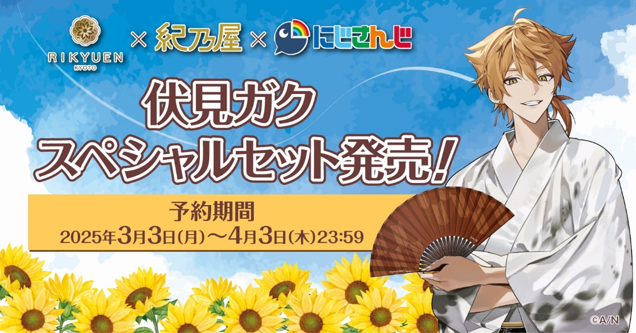 ANYCOLOR株式会社(代表取締役:田角陸/本社所在地:東京都)と、株式会社紀乃屋(代表取締役:中井誠/本社所在地:和歌山県)と、株式会社京都利休園(代表取締役:中井保仁/本社所在地:京都府)は、2025年3月3日より、「にじさんじ」所属の有名VTuber「伏見ガク」プロデュースのコラボレーション商品『伏見ガク スペシャルセット』を販売開始いたします。