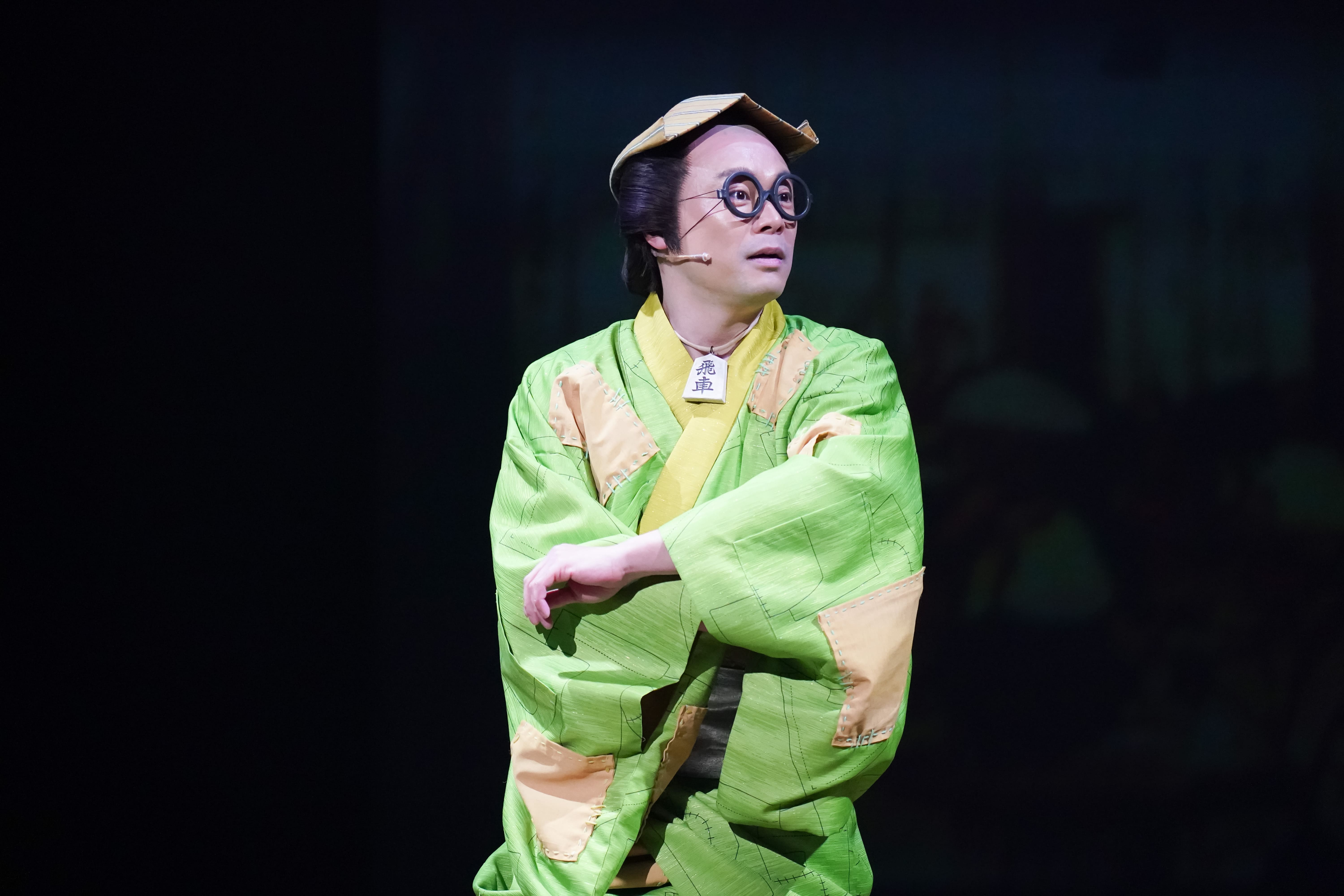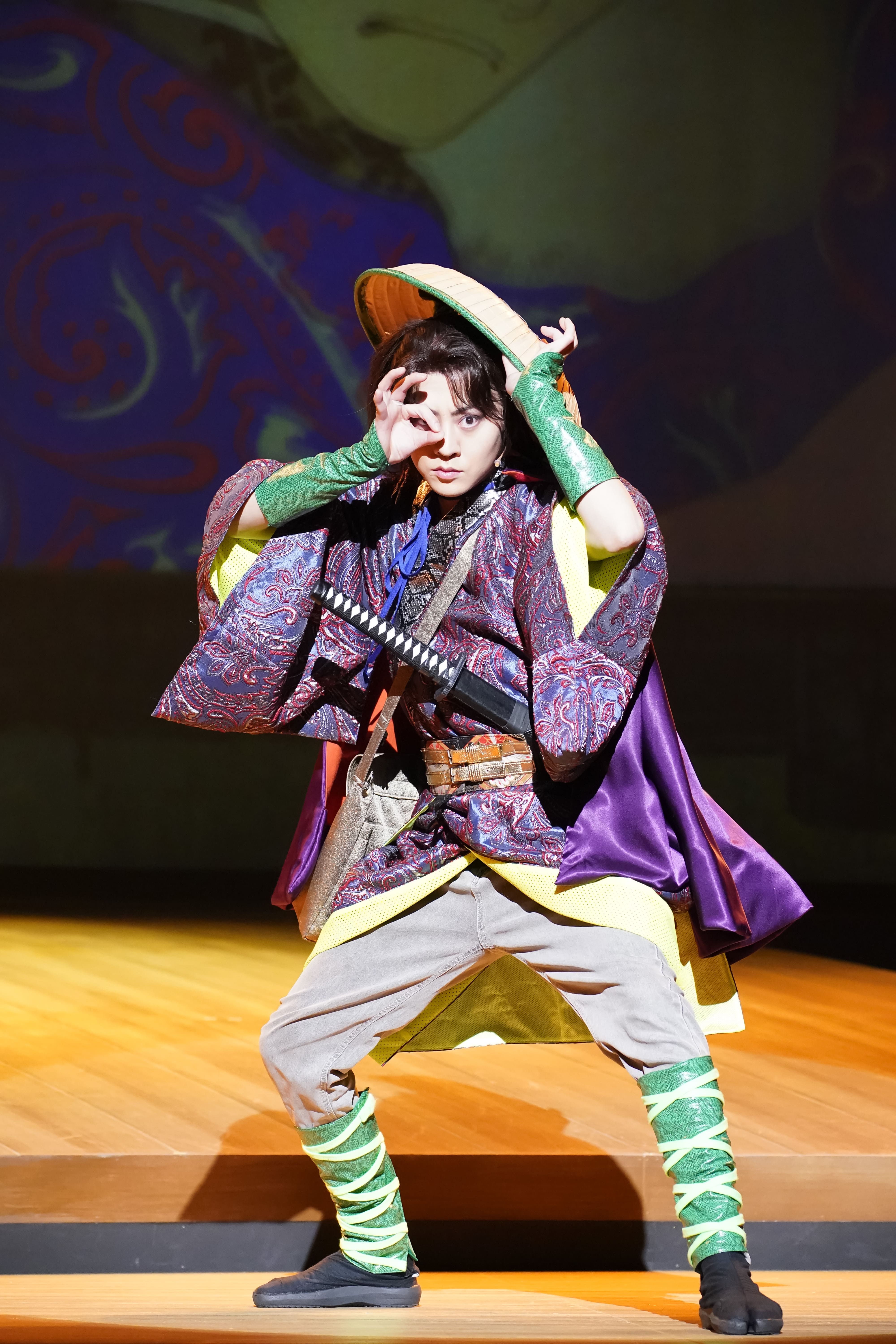 続いて行われたゲネプロ。幕が上がるとそこは江戸、旅芝居小屋の舞台上。三味線の調べと長唄、殺陣を取り入れた群舞に引き込まれ物語のなかに。喜多八(中川大輔)と弥次郎兵衛(牧島 輝)の出会いから、伊勢への旅が、スピード感のある映像と音楽、演者たちの歌や立ち回りで描かれていきます。ガラリと雰囲気が変わるのは、敵方の八乙女組の賭場。妖しげな光の中、「張った張った」と歌い上げる、女親分・お蝶(秋山菜津子)の妖艶さ。オジキと呼ばれる男(山本亨)の凄み。そして、待ってました!二代目・千里眼の瞬太郎(和田雅成)のクールなセリフは、柔らかく丁寧で逆に怖い! オジキが殺陣で魅せ、瞬太郎は千里眼を使ってスルスルと敵の間をすり抜ける。人の心を読み動く演出は必見です。