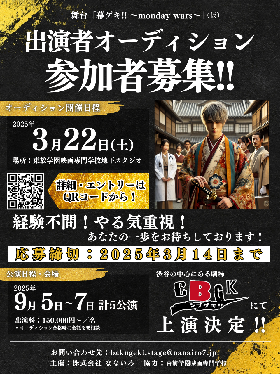 このたび、芸能事務所なないろ(株式会社七色 代表取締役:佐々木 綾香)は、2025年9月に上演予定の舞台「幕ゲキ!! 〜monday wars〜」(仮)の出演者オーディションを開催します。
