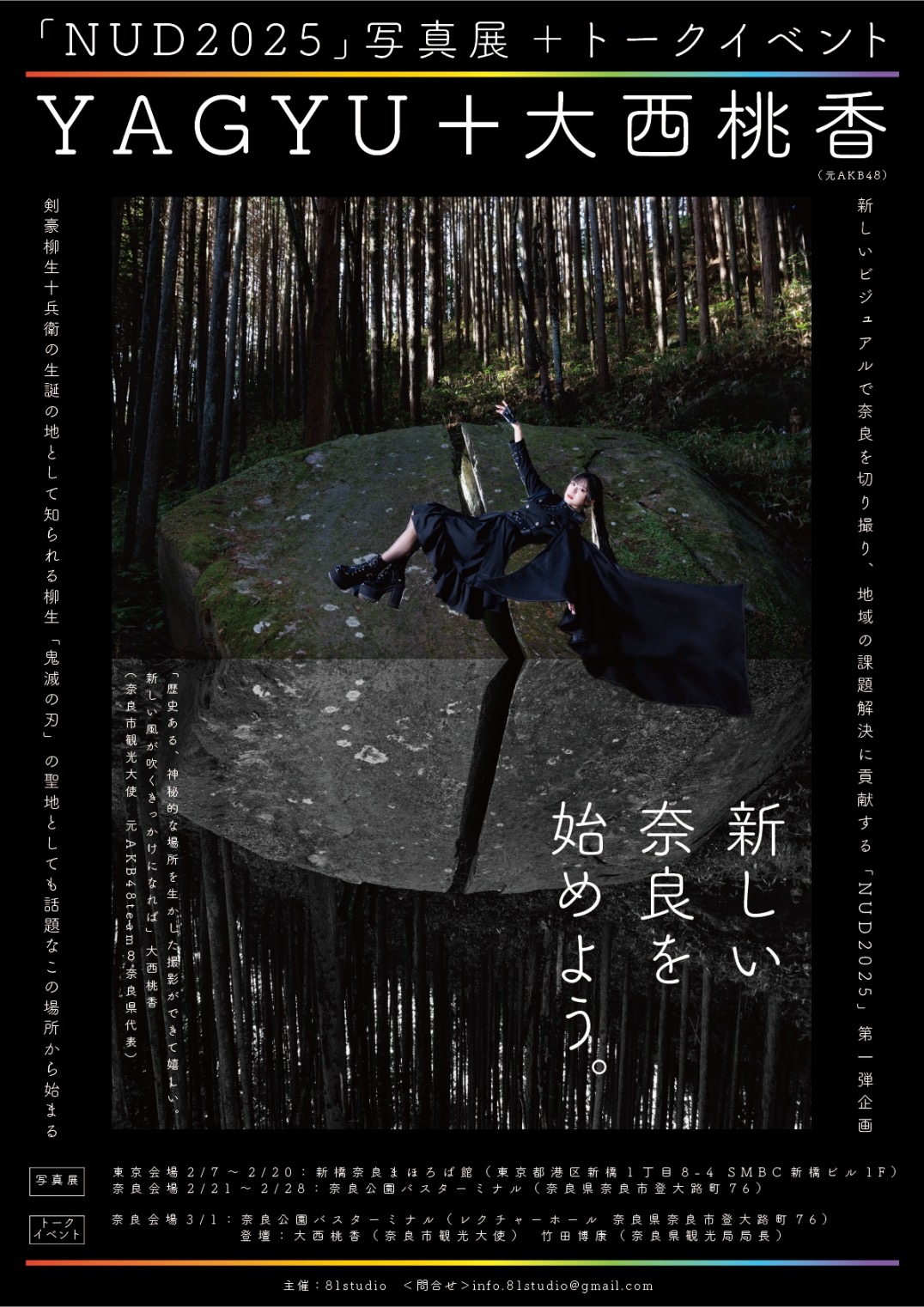 「NUD2025」は、東京で20年間芸能界や映画界の写真を撮ってきた、写真家の藤本礼奈(81studio主宰)が、新しい切り口のビジュアルで奈良切り撮り、今まで届かなかった層にも奈良の魅力を伝える企画。