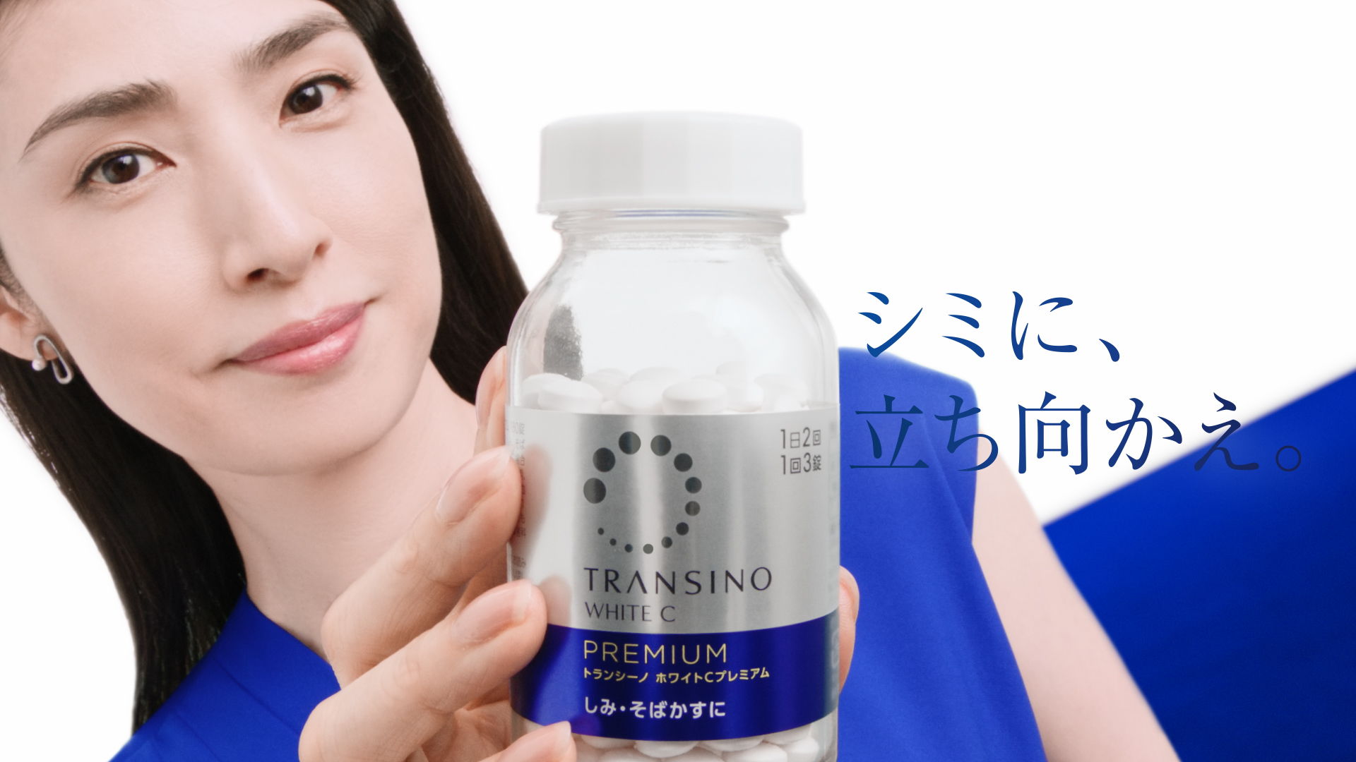 一面に広がる、印象的なブルーの世界からCMはスタート。「シミに、立ち向かえ。」というセリフと、ブルーのランウェイをまっすぐに歩く天海さんが、ホワイトCプレミアムの王道感としみに挑み続けるたゆまぬ姿勢を表現しています。ラストカットでは「これが、トランシーノの答え。」と力強く宣言。トランシーノを体現するような自信に満ちた天海さんの佇まいにぜひご注目ください。