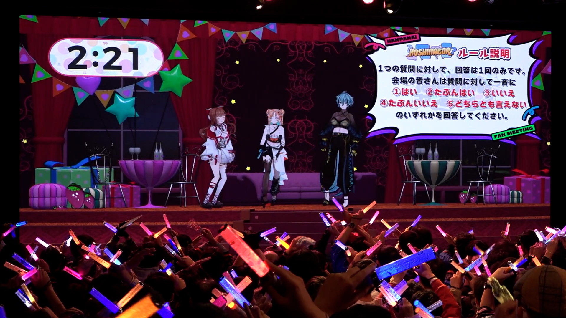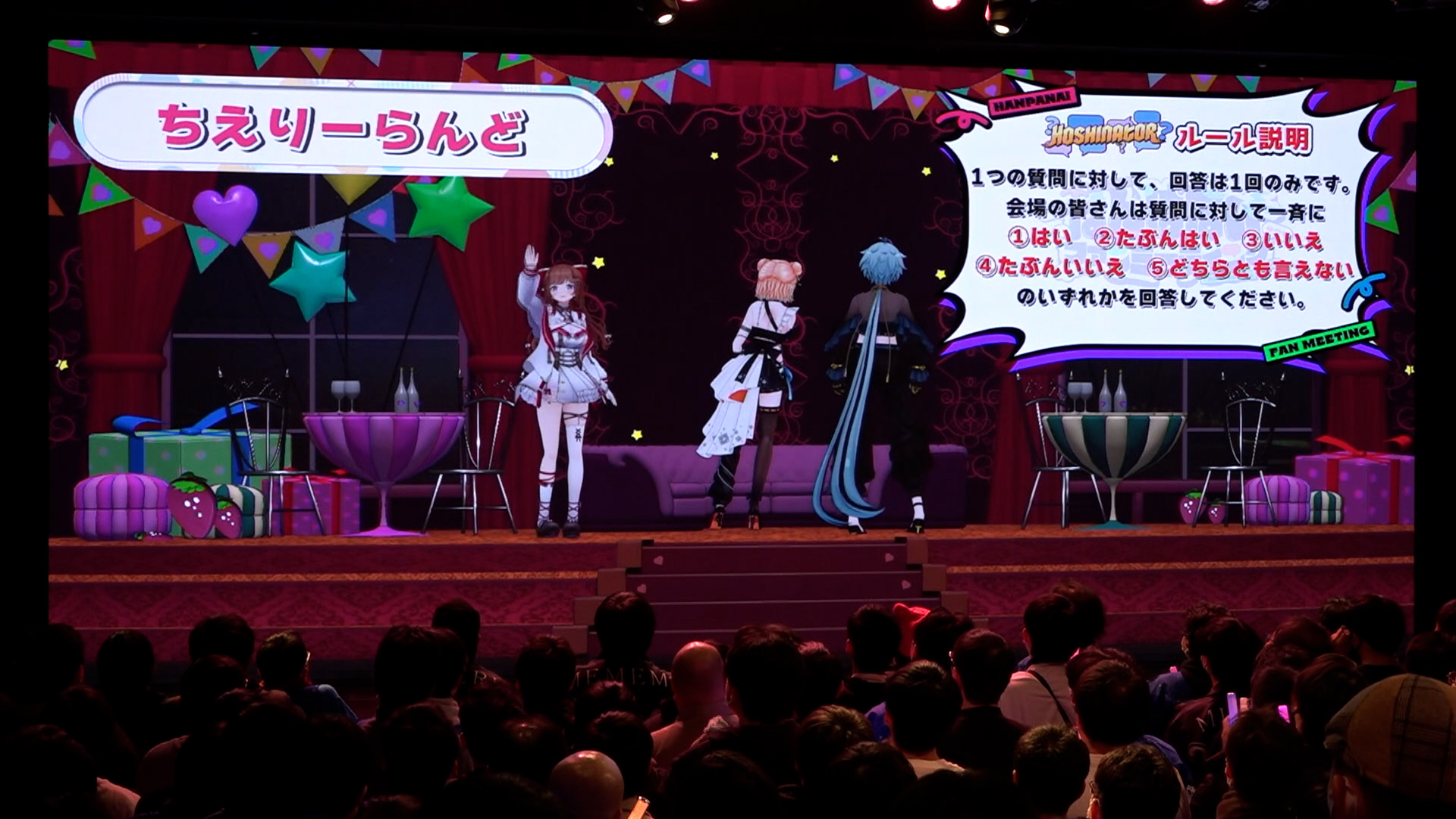 2つ目の企画は “Hoshinator”。観客を頼りながら制限時間内にお題が何かを導き出すというアキネーター風企画。「ちえりーらんど」「白爪草」「遊星ディスコ」というどっとライブにまつわるお題が出題され、観客は3人から提示される「はい」か「いいえ」か難しいラインの質問に戸惑いながらも全問正解へと導き、見事クリアとなった。