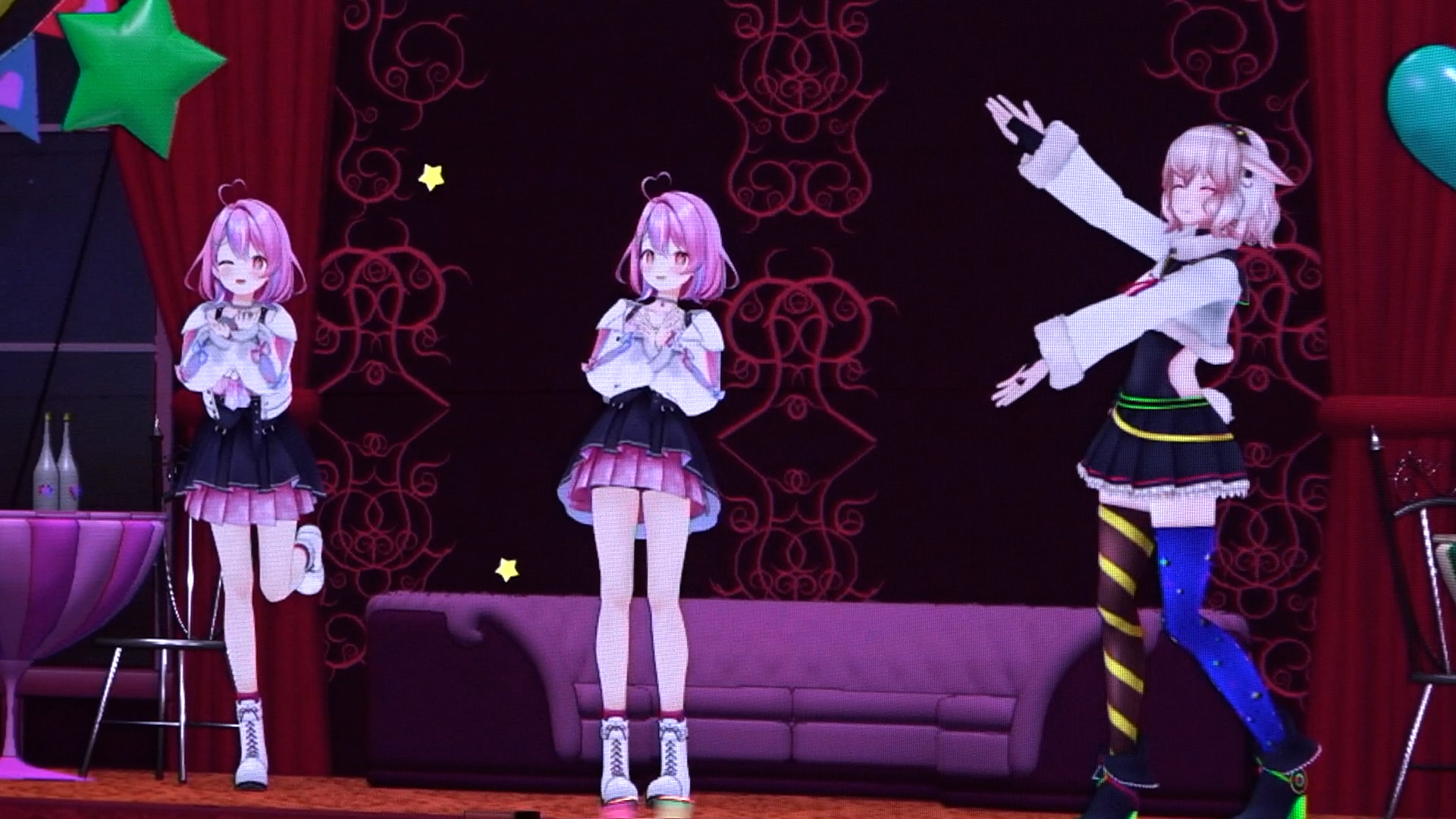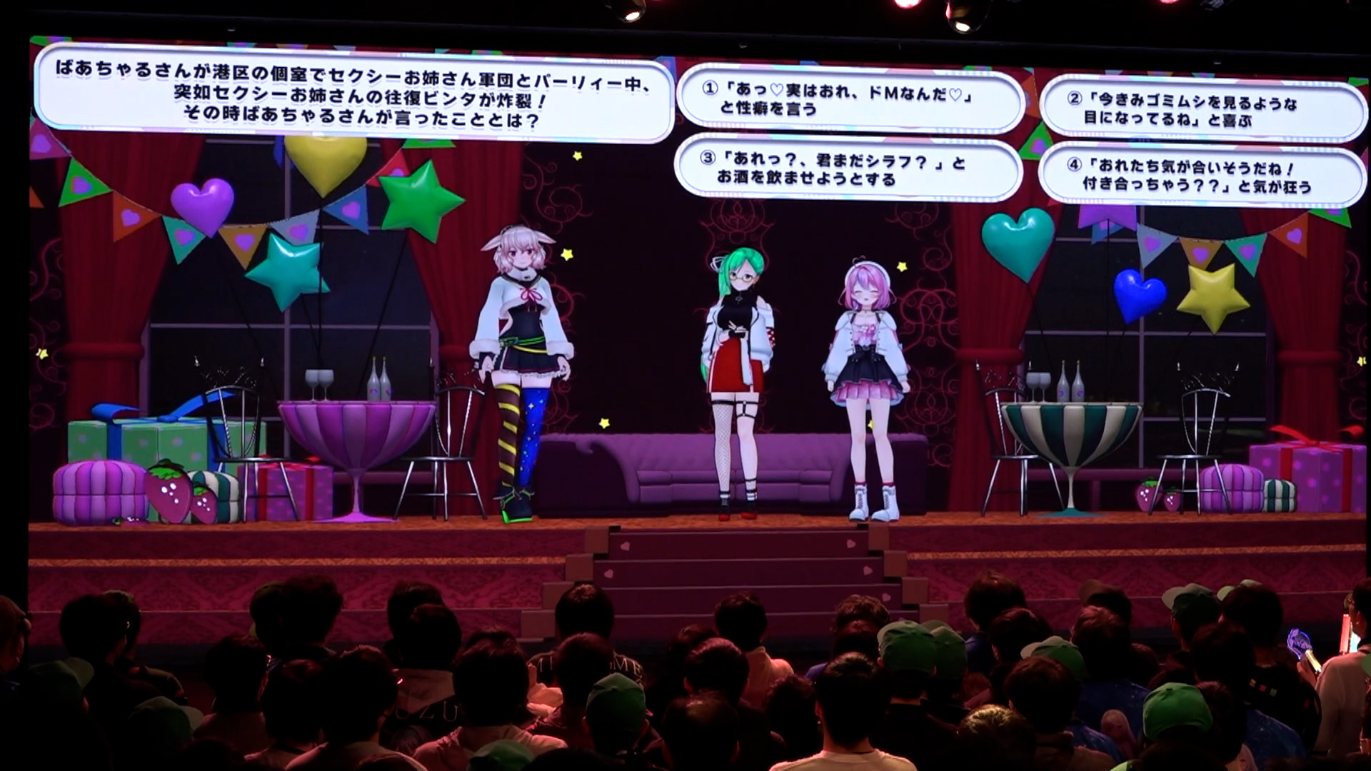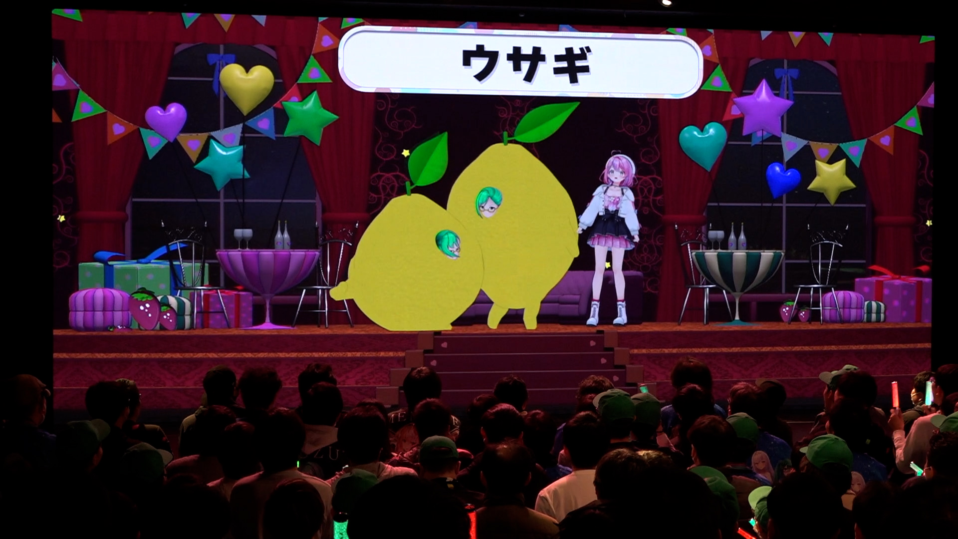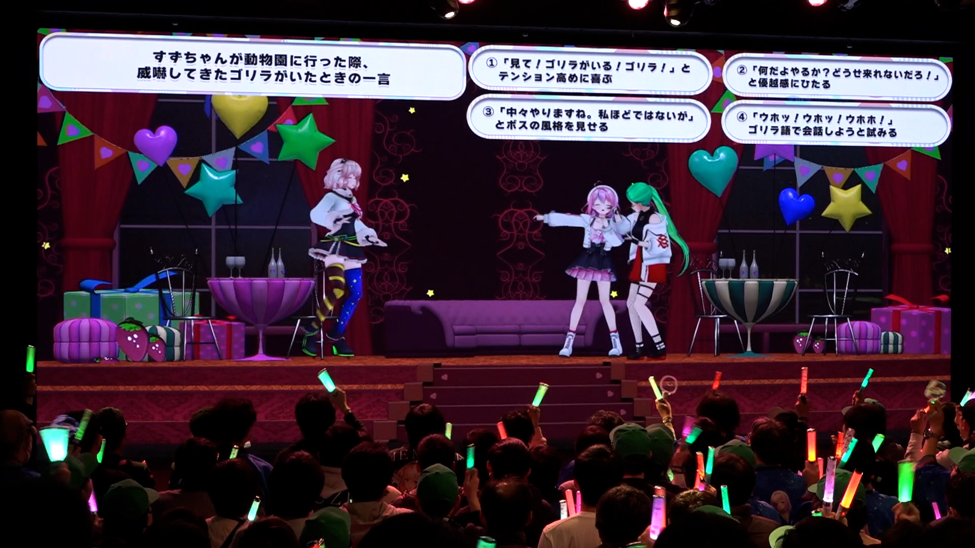 続く企画は “☆(推し)を探して”。魔法によって3人の内2人が同じ姿になり、どちらが本物かを観客が当てるという企画。先ほどの企画から一転、ファンの「メンバー理解度」が試されることに。「ソーラン節」「かっこいい決めポーズ」「ゴリラ」などポーズお題が出題され、戸惑いながらメンバーがポーズを取る場面も。ラストはレモン姿の神楽すずが殴り合いながら登場し、会場は大きな笑いと歓声に包まれた。