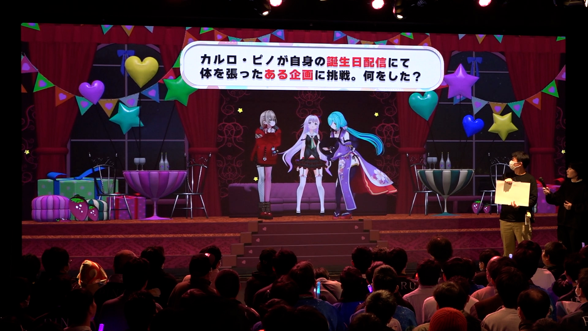 最初の企画は ”逆襲のメンテちゃん・マネちゃん”。スタッフより事前に募集した、カルロ・ピノ、ヤマト イオリ、紅蓮罰まるにまつわる裏話や良いところ、直してほしいところを公開。初めて公開される情報に、他の出演者と観客の大きな笑い声や驚嘆する声が響いた。