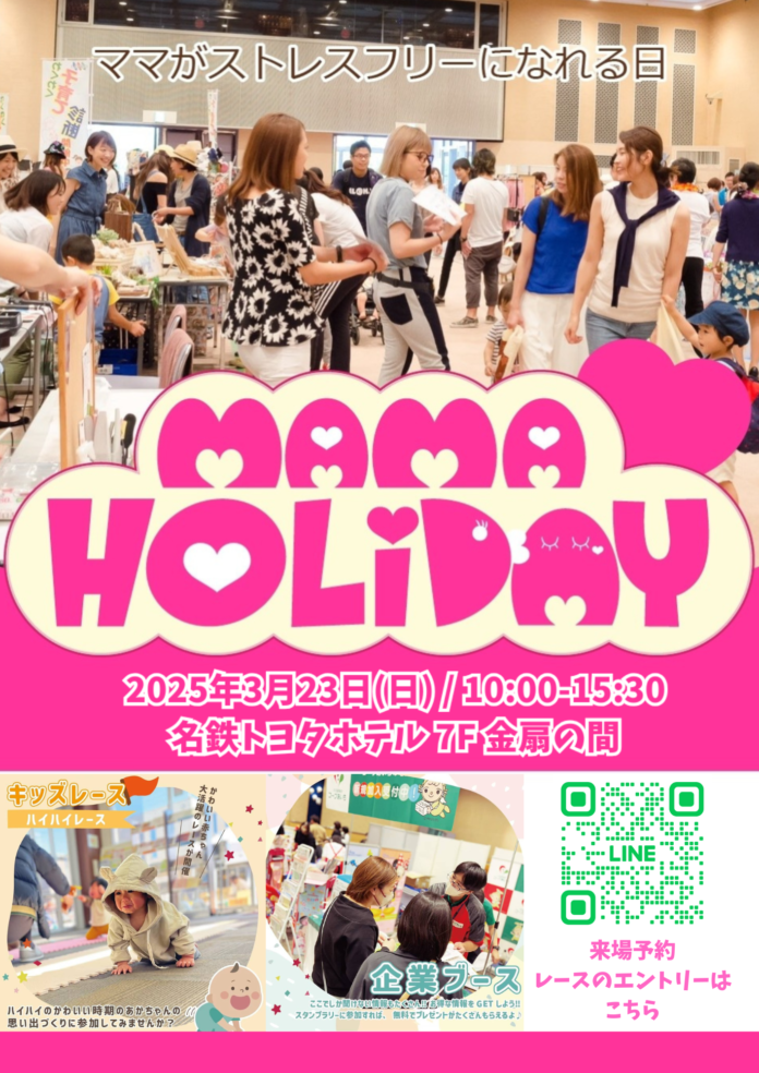 「ママHOLIDAYフェスタ」は、育児中のママの不安を解消し、社会との繋がりを深めることを目的としたイベントです。名鉄トヨタホテルでは、開業30周年を記念し、日頃頑張るママと子どもたちが一緒に楽しめる特別な企画をご用意しました。妊活中の方、プレママ、子育て中のママ、ぜひご家族でお越しください。