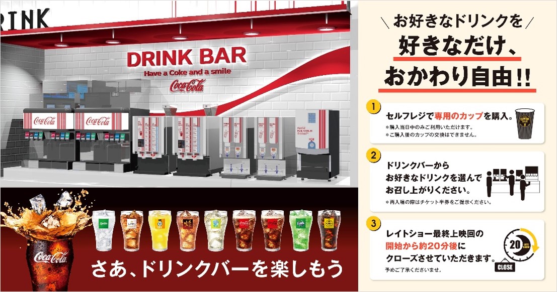 コンセッションのドリンクバーでは、お好きなドリンクが、好きなだけおかわり自由!レジで専用カップをご購入頂き、ホット・アイス、お好きなドリンクを選んでお召し上がりいただけます。