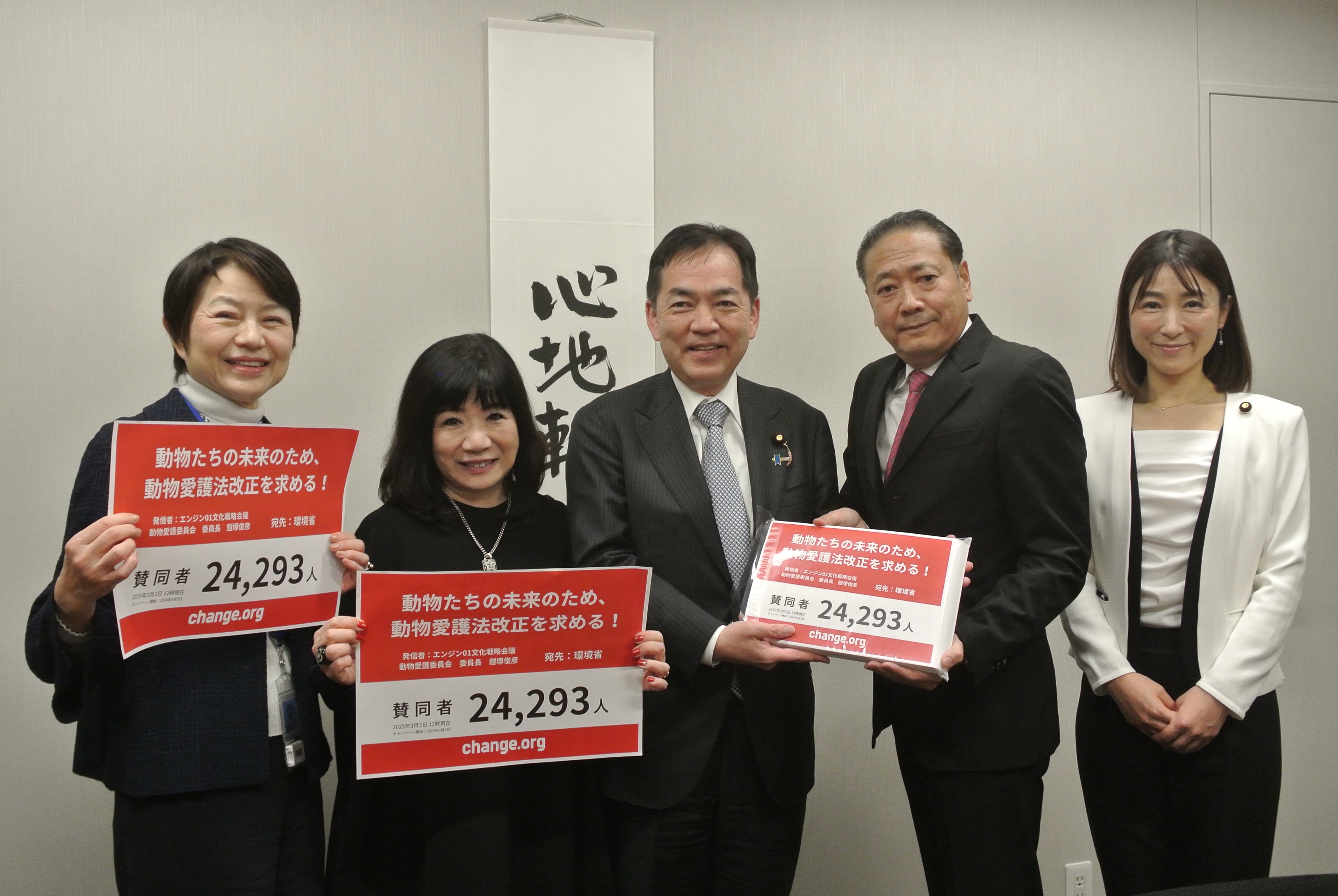 エンジン01文化戦略会議の「動物愛護委員会」は3月5日、次の動物愛護法改正によって「真に動物を守れる法制度」が実現することを求めて、多くの皆さんからいただいた署名2万4293筆を浅尾慶一郎・環境大臣に提出してきました。
