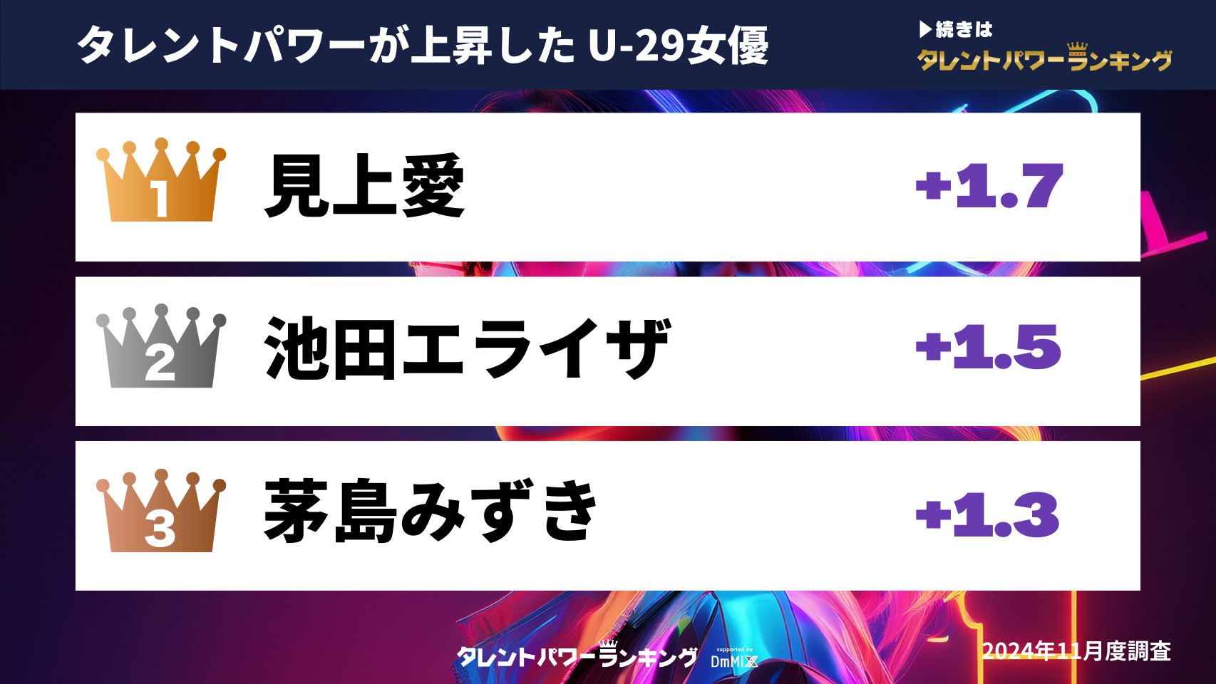 『タレントパワーランキング』では、2024年8月調査と2024年11月調査の間で、パワースコアが最も上昇した29歳以下の男優・女優に焦点を当て、ランキング形式にまとめました。