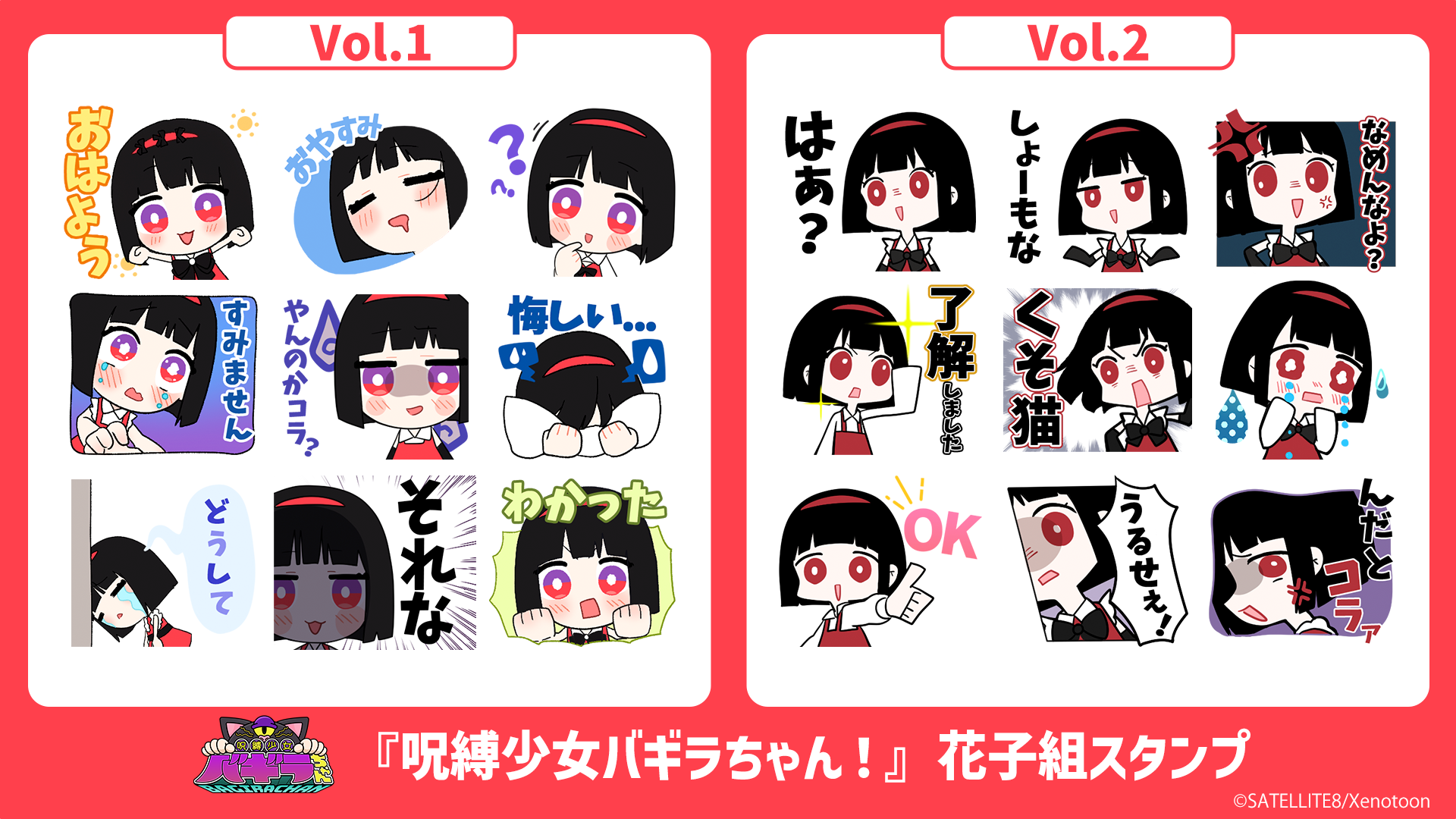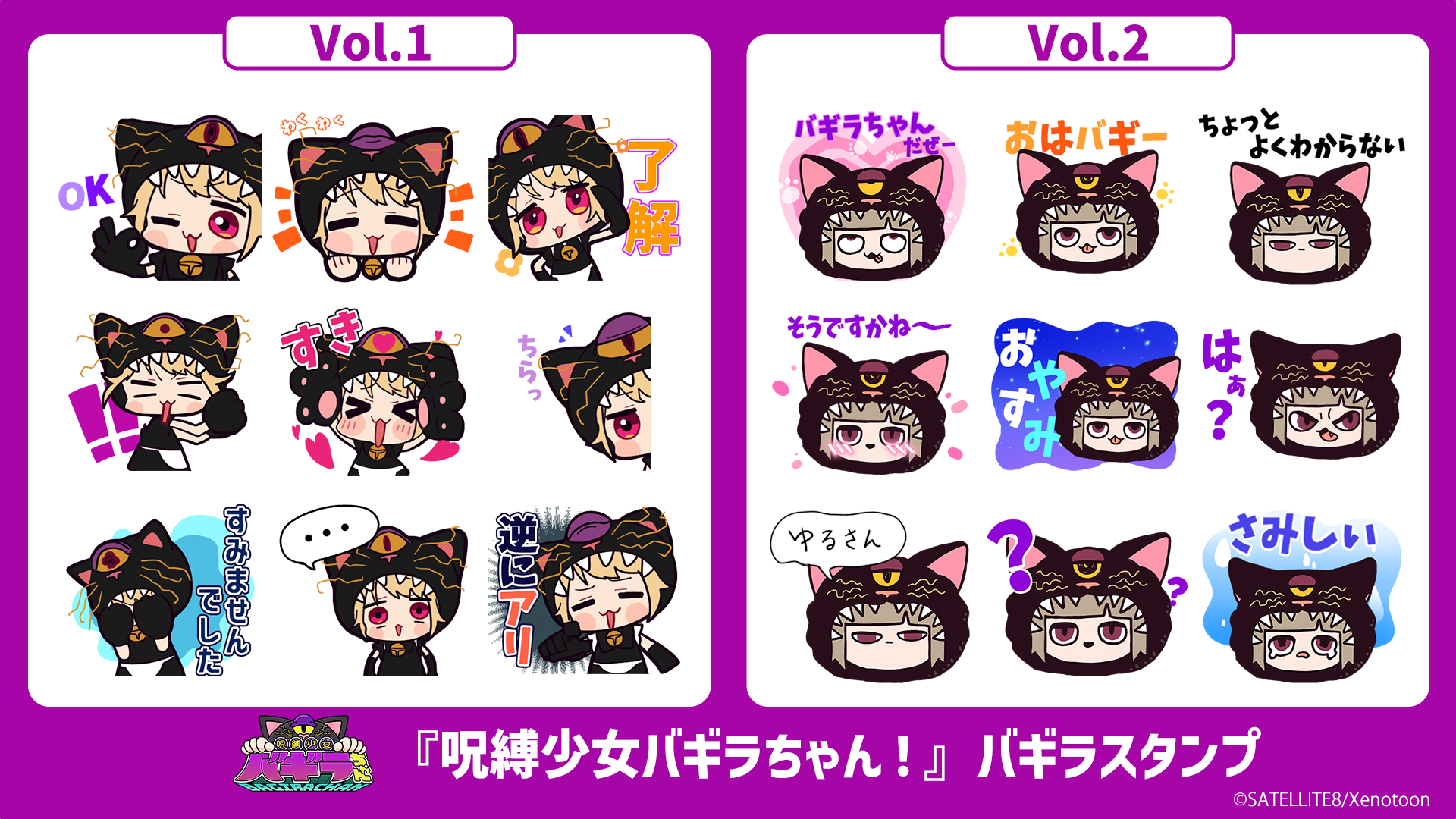 『呪縛少女バギラちゃん!』に登場するバギラと渋谷花子のスタンプがそれぞれ登場!使いやすい日常のあいさつやリアクションが中心のVol.1にくわえ、作中に登場するセリフを中心としたVol.2も同時発売。作中に登場するバギラと渋谷花子のスタンプとともに、LINEトークをお楽しみください。