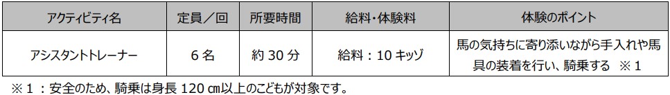 一般公開に先駆けて、一足早く「ホースセンター」パビリオンの3つのアクティビティ、「獣医師」「アシスタントトレーナー」「乗馬体験」を体験した竹内さんから、それぞれのユニフォームを着用したこども達に対して、各アクティビティの体験内容について紹介しました。