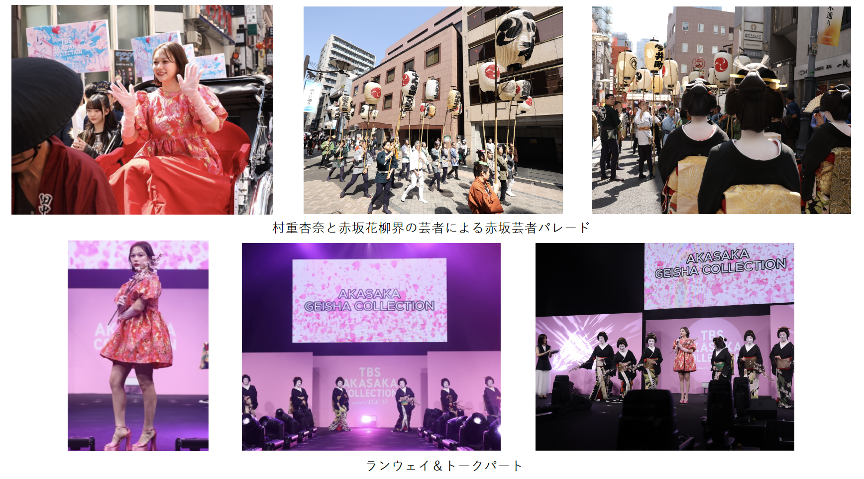 江戸時代から続く伝統的な遊郭文化が色濃く残る赤坂花柳界の芸者とコラボし、この日限りのスペシャルなステージ「AKASAKA GEISHA COLLECTION」を行いました。「旭日双光章 芸術文化功労」を受章した赤坂育子氏をはじめ、多くの芸者が赤坂の街を練り歩き、ステージでは全員でランウェイを披露。さらに、人気タレント村重杏奈も参加し、TGCを代表する桜や春をイメージしたピンク色の華やかな衣装を身に纏い、会場を盛り上げました。パレードの感想を聞かれた村重は「人力車に乗ってTBSに入ったタレントは今までいないと思うので、とても嬉しいです。多分、梅沢富美男さんでもないと思うので、“初”人力車タレントになれました!」と興奮気味に語ると、赤坂育子氏とのクロストークでは「育子さんにずっと孫と呼ばれていました。本当のおばあちゃんみたいで、仲良くなれて嬉しいです!」と、改めて参加できた喜びを伝えました。