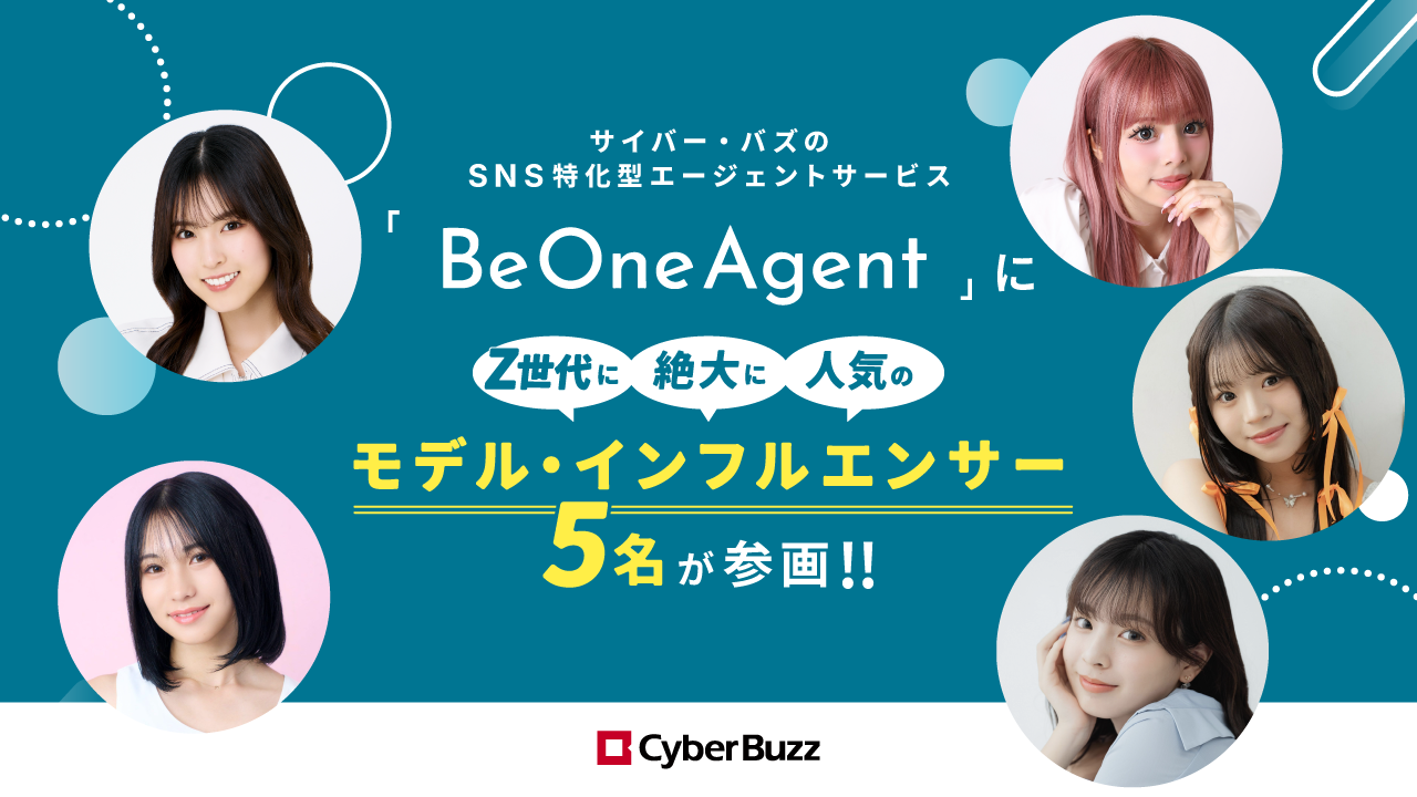 ソーシャルメディアマーケティング事業を展開する株式会社サイバー・バズ(本社:東京都渋谷区、代表取締役社長:髙村 彰典)は、SNS特化型のタレント・クリエイター向けエージェントサービス「Be One Agent」において、新たにZ世代に絶大な人気を誇る恋愛リアリティ番組の出演者を含む5名の人気モデル・インフルエンサーと提携したことをお知らせいたします。