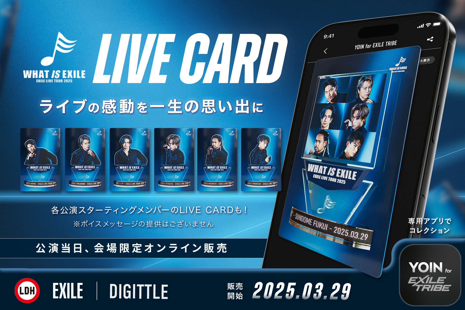 株式会社Digittle(本社:東京都渋⾕区、代表取締役:韮澤 真⼈、以下当社)は、株式会社LDH JAPAN(本社:東京都目黒区、代表取締役社長:五十嵐広行 以下、LDH)の所属アーティストEXILEが3月29日から開催するライブツアー「EXILE LIVE TOUR 2025 “WHAT IS EXILE”」にて、ライブ参加記念のデジタルグッズ「LIVE CARD」を販売します。