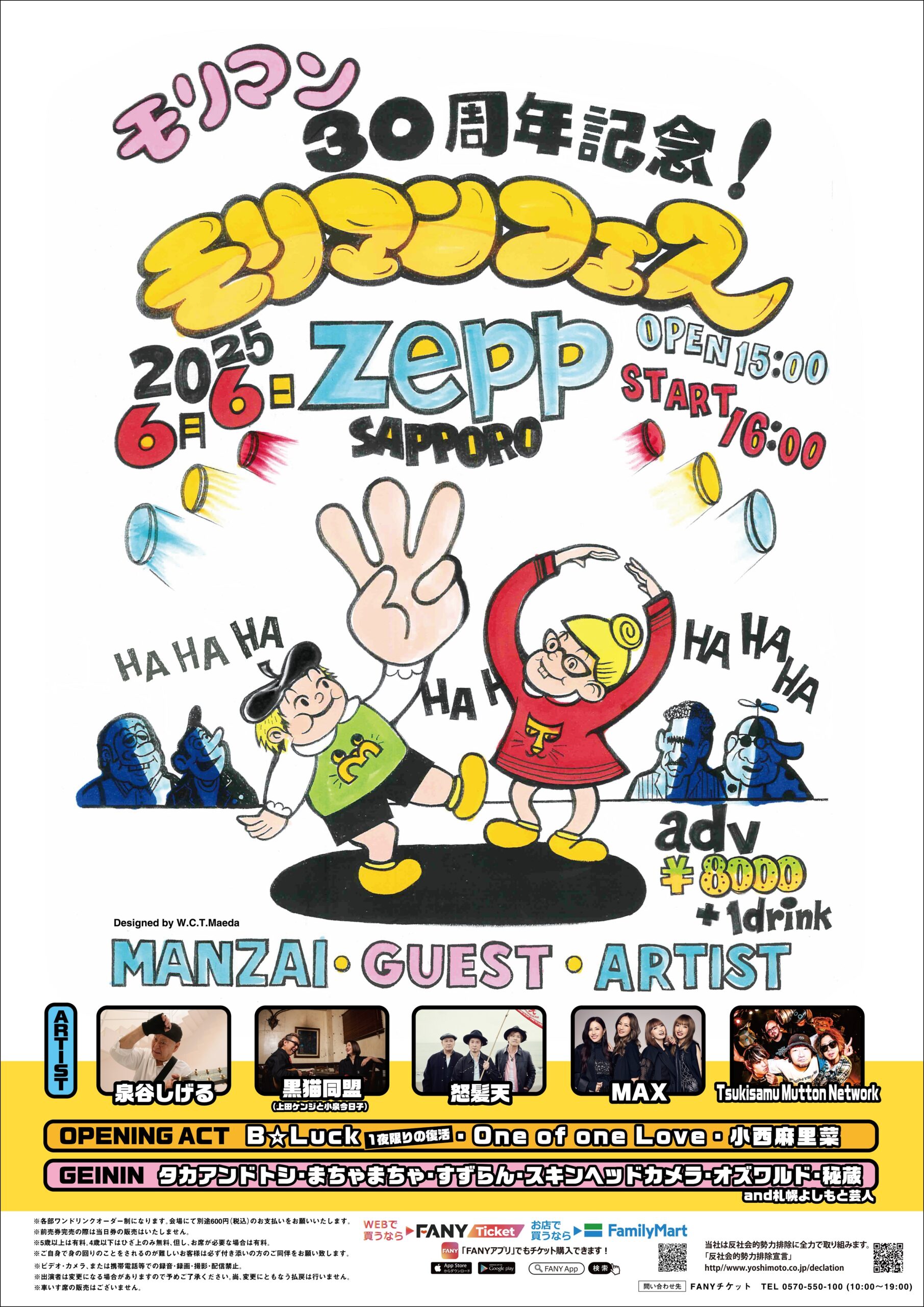 モリマンと親交の深いアーティストに「30周年を祝ってほしい!」と、自ら出演交渉し、豪華アーティストの方々が大集合します。また、同じく30周年を迎えたタカアンドトシや北海道出身のオズワルドなども出演、札幌よしもと所属芸人も全員で会場を盛り上げます。キービジュアルは、W.C.T Maeda氏にお願いし、モリマンらしいビジュアルも完成しました。