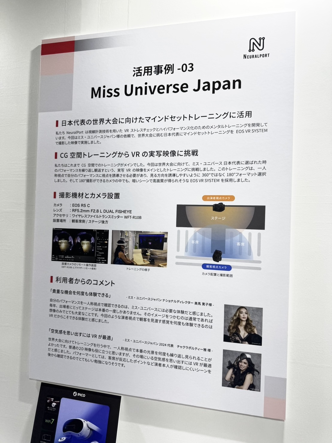 NeuralPort Inc., a sports brain-tech company specializing in gaze and neuroscience research (Headquarters: 1-8 Iwaencho, Ashiya City, Hyogo Prefecture, Partiya Ashiya II 2F; CEO: Anna Shimafuji), showcased its latest VR technology at the Canon booth during Inter BEE 2024, held at Makuhari Messe from November 13 to 15, 2024. The exhibited VR mindset training system, designed to enhance mental and cognitive performance, was used by Japan’s Miss Universe 2024 representative during her preparation for the world competition. This VR training content supports users in achieving their goals and boosting their confidence.