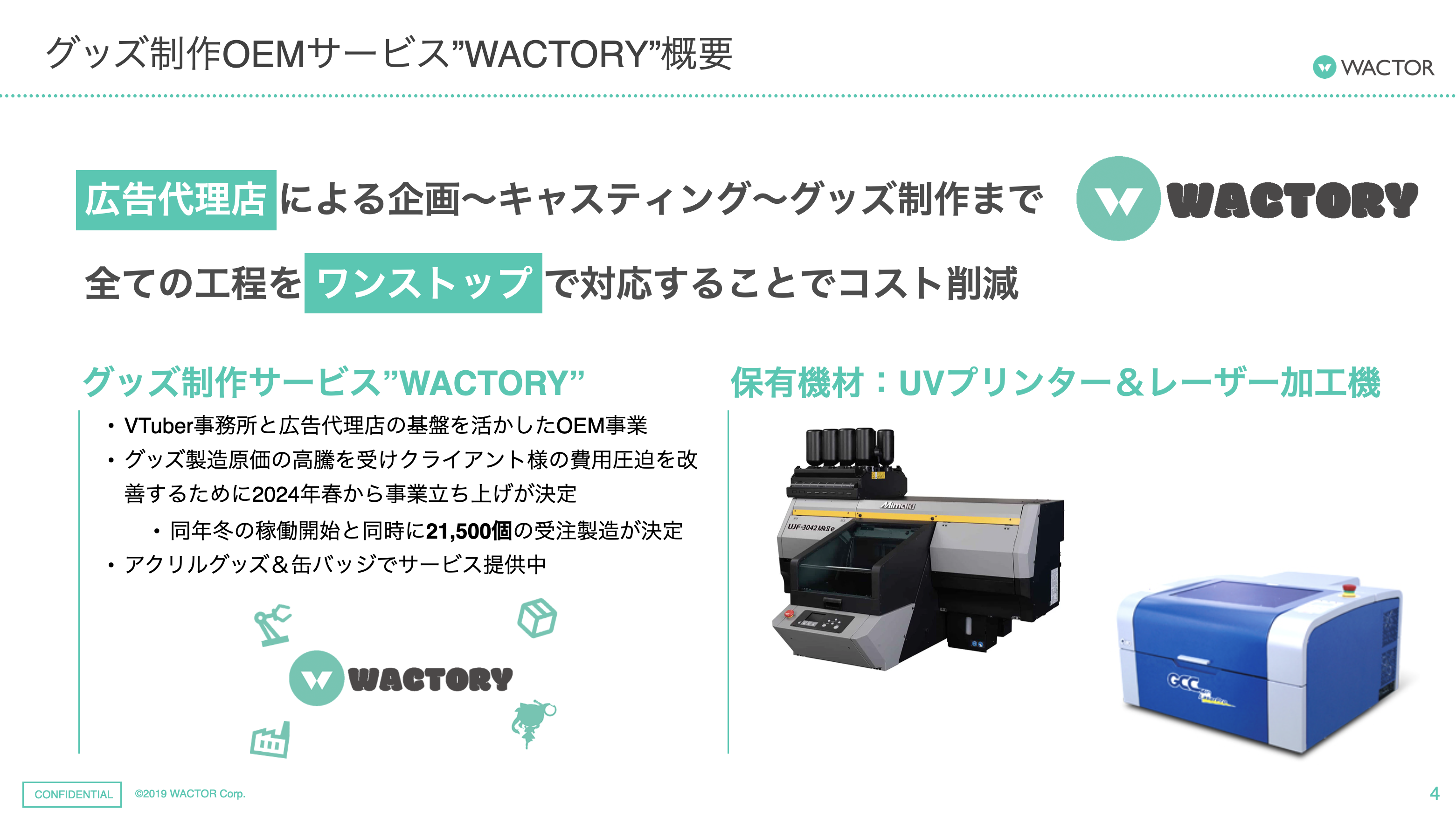 VTuber事務所である広告代理店でもあるWACTORが、原材料高騰が続くグッズ制作の課題を解決するために立ち上げた自社工場によるアクリルグッズ全般&缶バッジの制作を受託するOEMサービスです。広告代理店として担当するプロモーションにおいては特別価格での提供を展開中。
