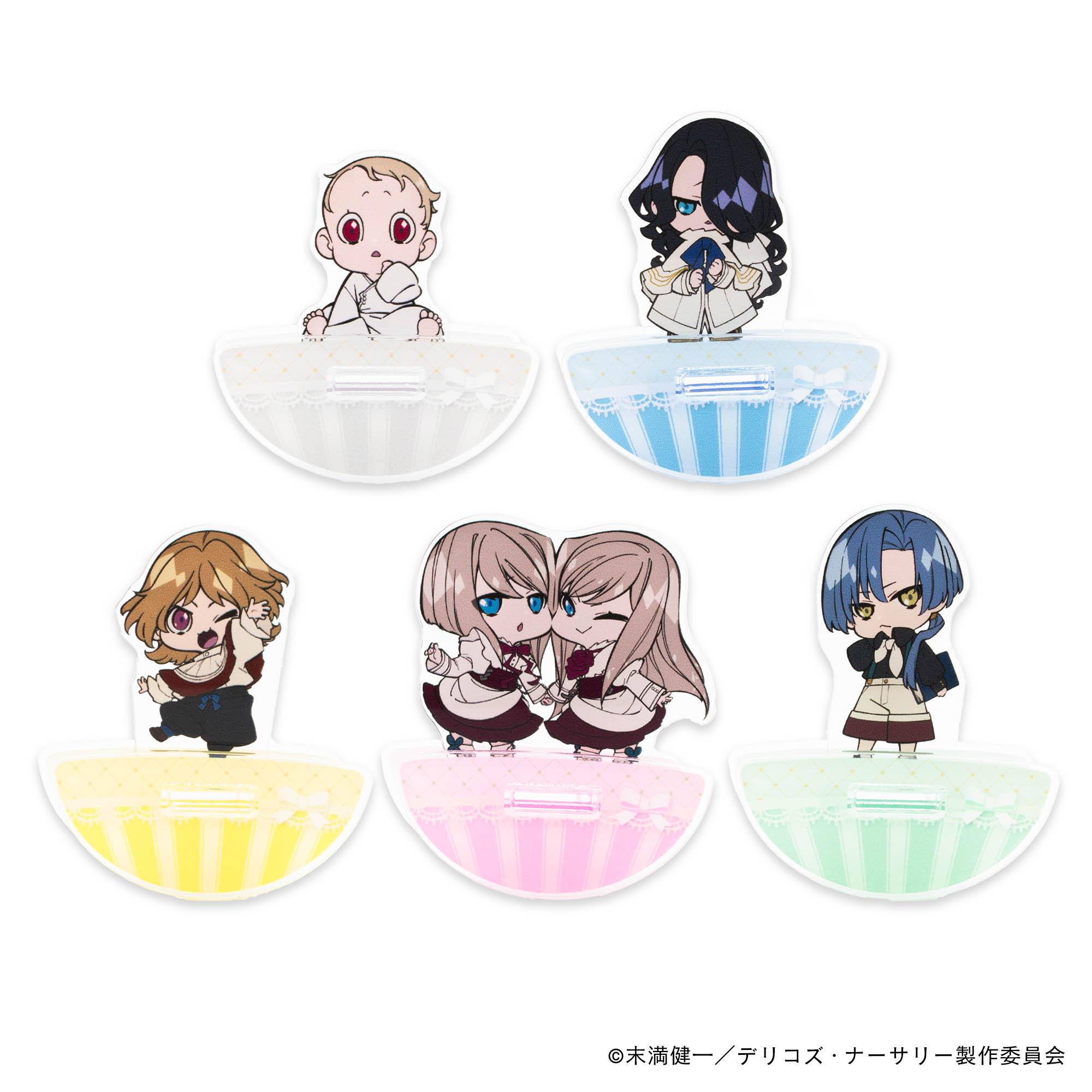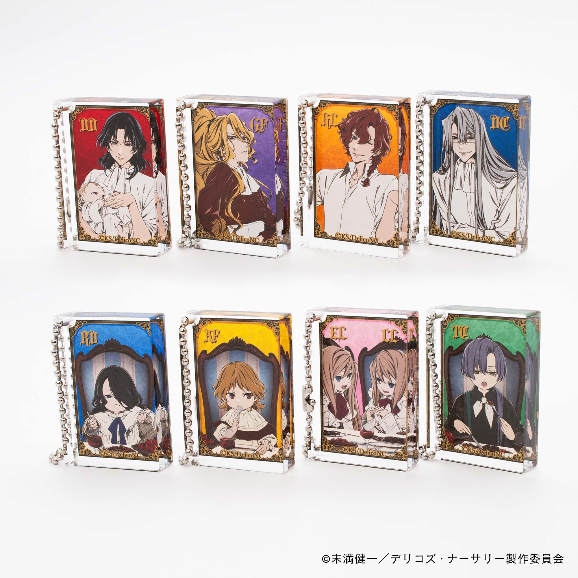 TRUMPシリーズTVアニメ『デリコズ・ナーサリー』(以下、『デリコズ・ナーサリー』)の世界観を踏襲しつつも、公式ミニキャラの可愛さを存分に味わうことのできるアイテムや、キャラクターたちのカッコよさ・美しさをそのままに楽しむことができるアクリルブロックキーホルダー、そしてTVアニメを記念して1セットは持っておきたいフレーム切手など全32種のグッズがラインナップします。