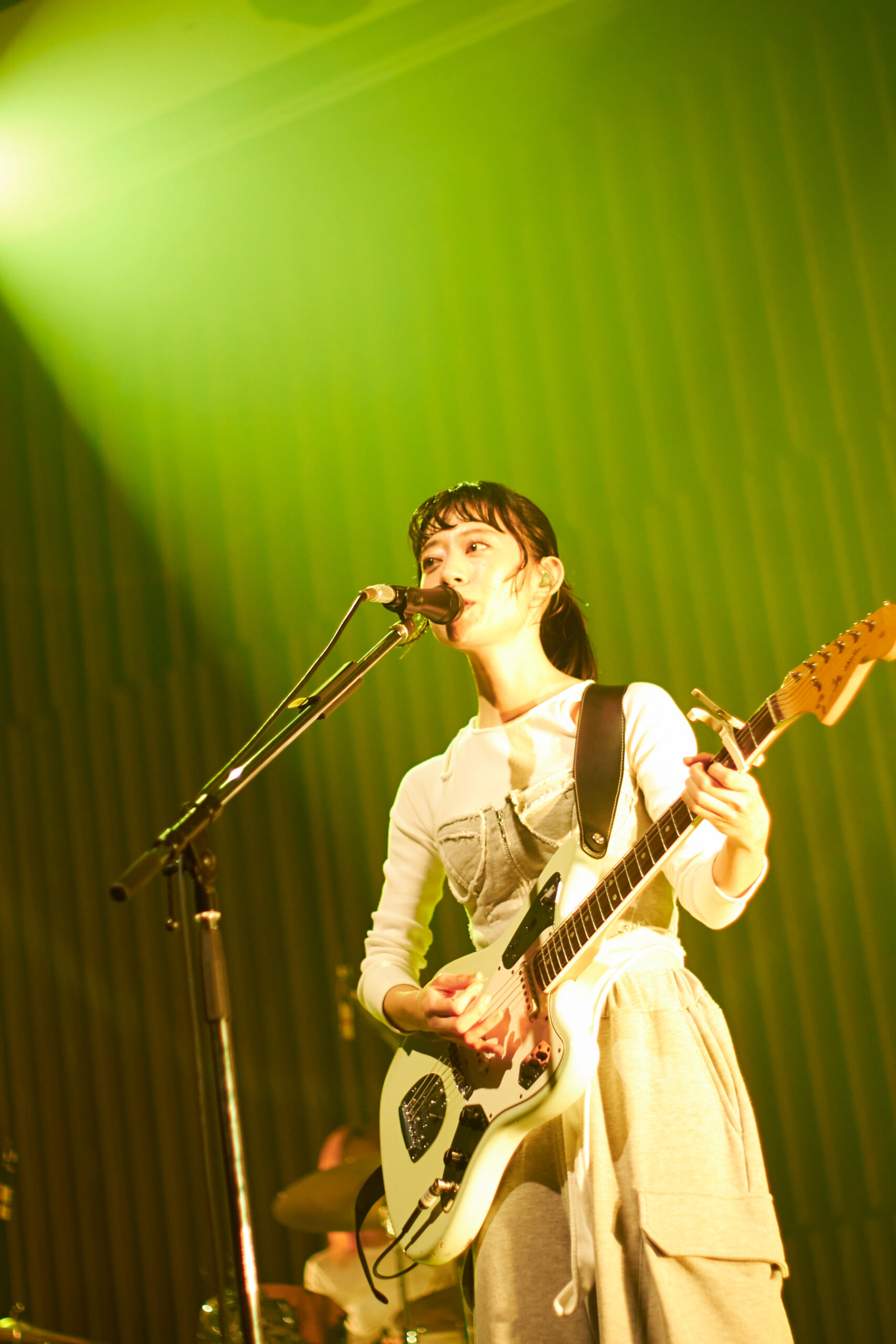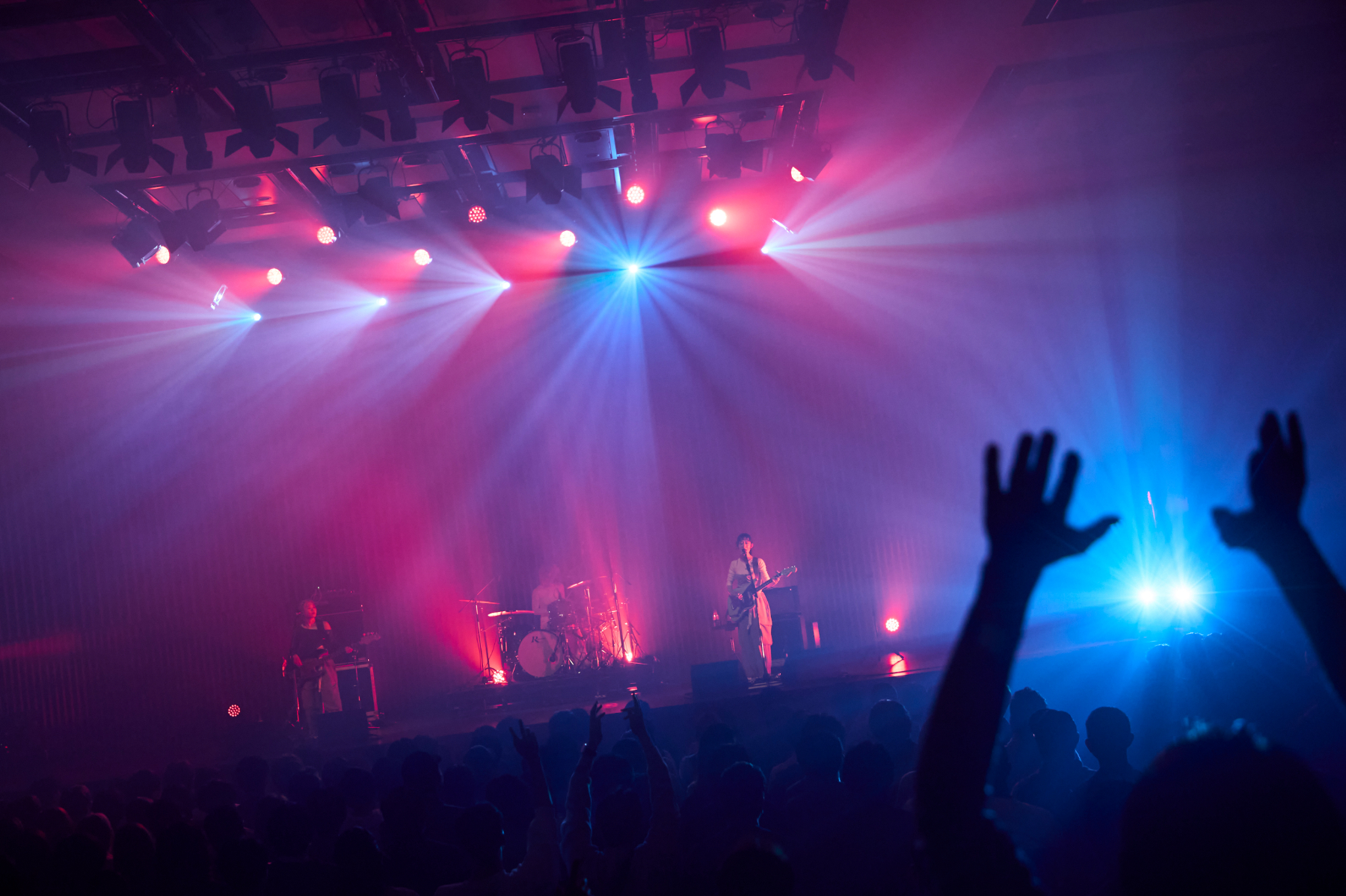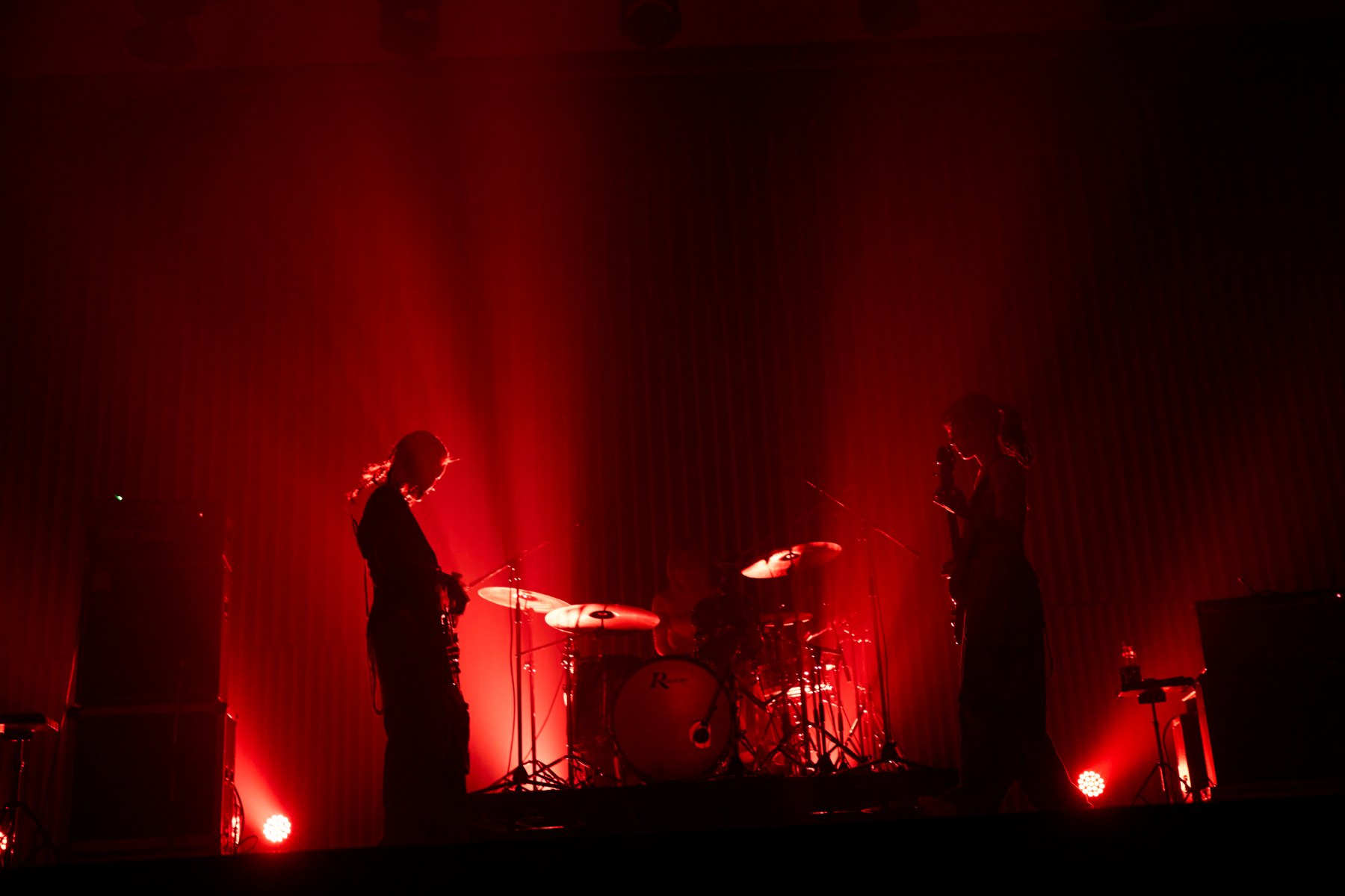 クリス・ペプラーに呼び込まれてステージに静かに登場した塩塚モエカ(Vo, Gt)と河西ゆりか(Ba)、サポートドラマーのYUNAの3人は、<朝へゆく船はいま動き出す>という歌詞から始まる「hopi」で厳かにライブの幕を開ける。豊潤なバンドサウンドと美しいコーラスが広がり、場内はコンサートホールへとあっという間に様変わり。さらにメンバーも表情を緩ませた「あいまいでいいよ」「深呼吸」を続け、一気に羊文学の世界へ誘った。
