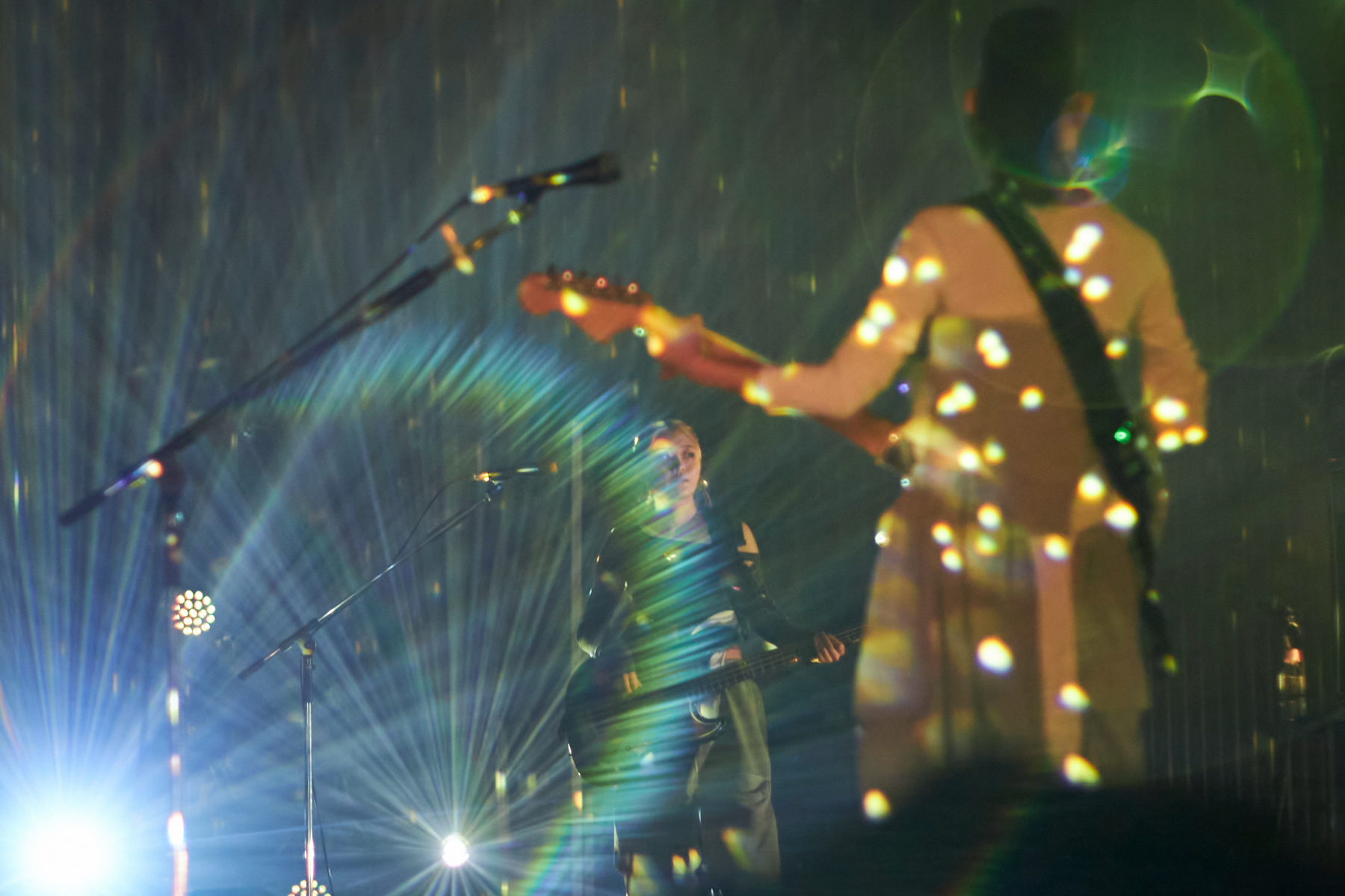 3曲を終えて最初のMCになると、挨拶もそこそこに2人は「未来体験シアター絶対に見たほうがいいよ」とおすすめ。また自身がJ-WAVEの番組『GURU GURU!』内のコーナーナビゲーターを務めていることから、リスナーの存在も客席に確認するなど、ファンとのコミュニケーションを図ったあと、ひときわ力強いボーカルとギターソロを聞かせた1月リリースの楽曲「声」でライブを再開。ギターのアルペジオがやわらかく包み込む「tears」、客先から自然とハンドクラップが上がった「マヨイガ」、生命力あふれるビートとダイナミックなサウンドが場内を満たした「光るとき」と多彩な楽曲群で会場を染めていった。