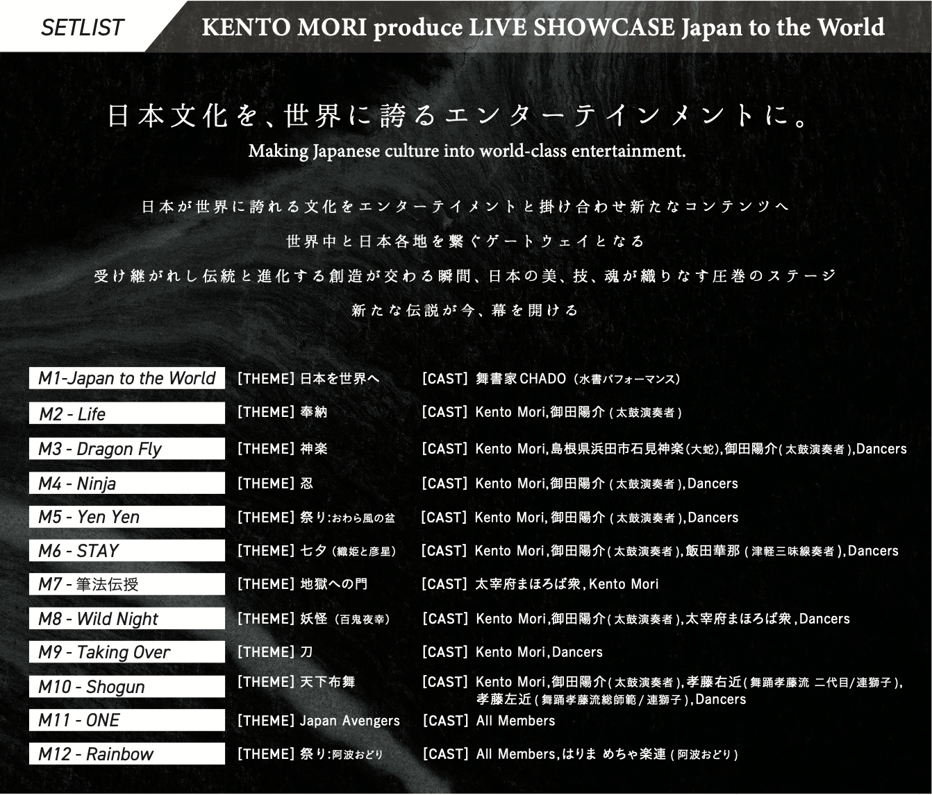 このプロジェクトは、世界的アーティストと共に、50 カ国 200 以上の主要都市にて、そのステージに立ち続けてきた 世界最高峰の表現者 ケント・モリが、これまでの人生を通じて各国の人や文化と触れ合い、日本では全国各地をダンスワークショップで回り続け、そこで体験してきた、日本の伝統文化の素晴らしさ、そこに宿るメッセージ、精神性はそのままに、全く新しいエンターテイメントとして、全面プロデュースを行い日本が世界に誇るコンテンツとして創り上げました。