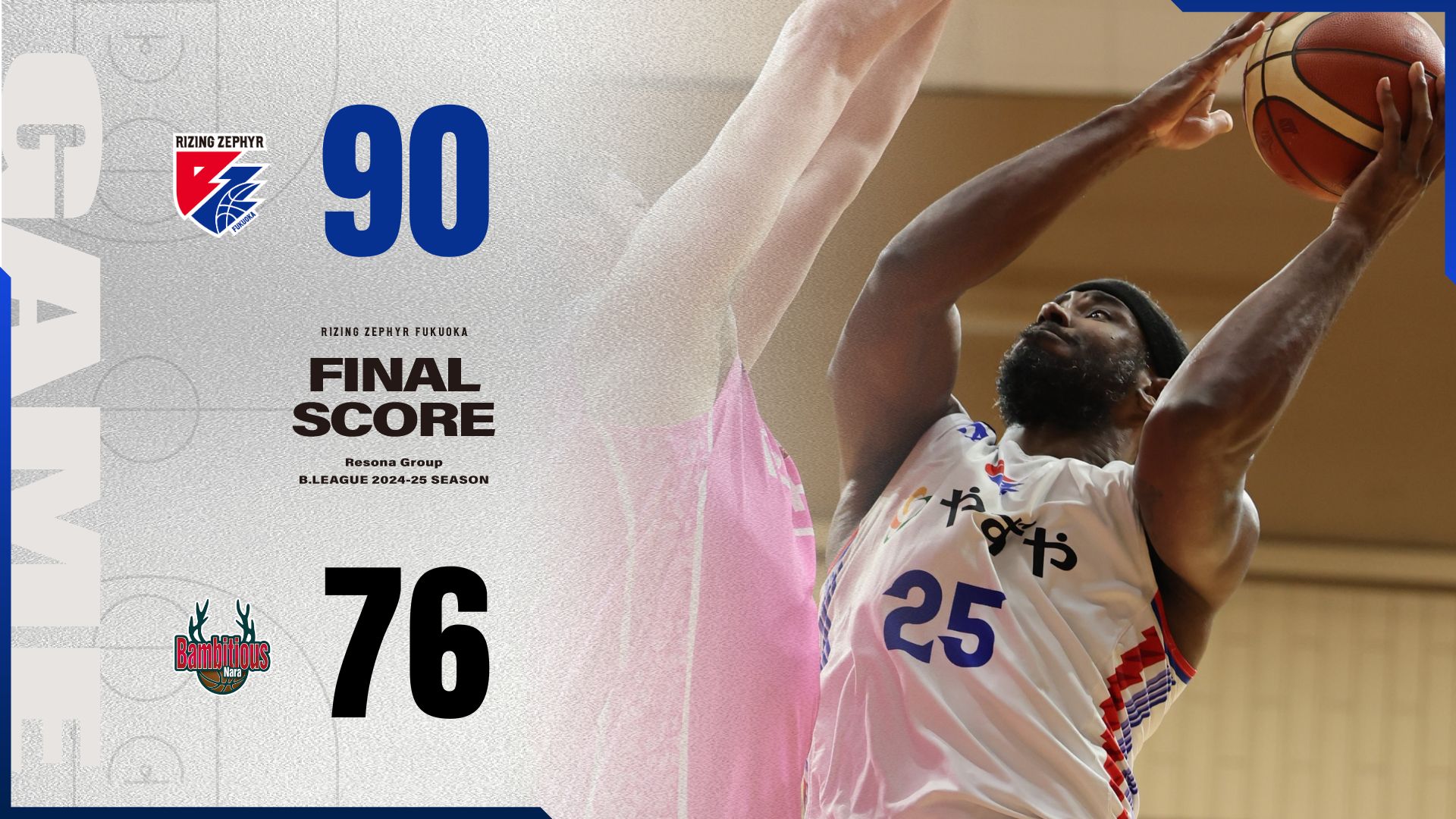 2025年4月6日(日)に開催した、りそなグループ B.LEAGUE 2024-25 シーズン【ライジングゼファーフクオカ vs.バンビシャス奈良】は、“福岡 90-76 奈良”で福岡の勝利となりました。