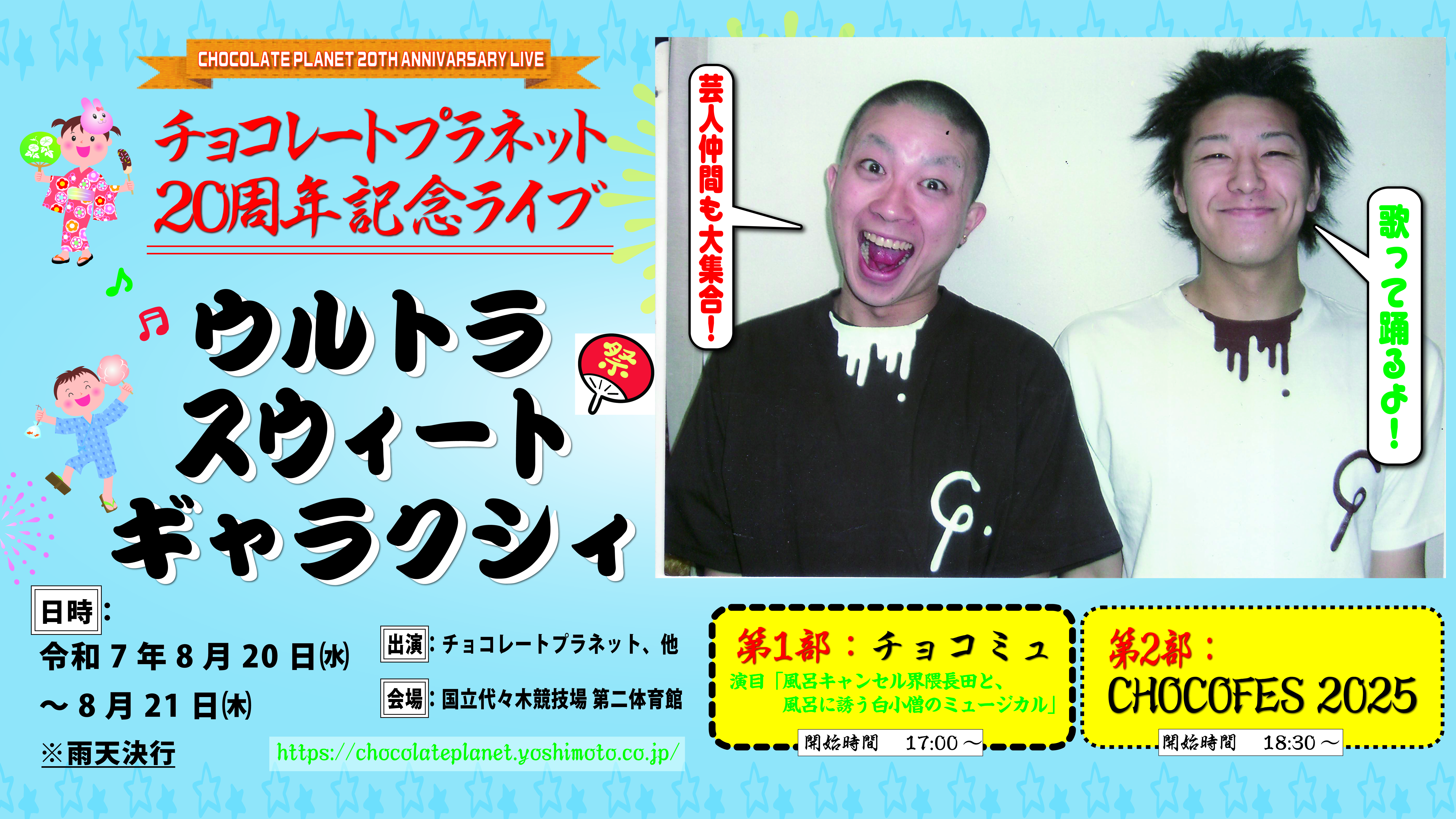 吉本興業所属のお笑いコンビ・チョコレートプラネットの結成20周年を記念したライブ “CHOCOLATE PLANET 20th ANNIVERSARY「ULTRA SWEET GALAXY」が、8月20日(水)、21日(木)に開催されます。